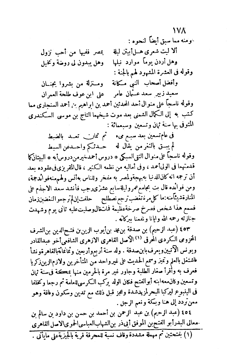 453 - عبد الرَّحِيم بن صَدَقَة بن مُحَمَّد بن أَيُّوب الزين بن فتح الدّين بن الشّرف المَخْزُومِي الْكرْدِي المحرقي الأَصْل القاهري الْأَزْهَرِي الشَّافِعِي أَخُو عبد الْقَادِر وَيُونُس / الآتيين وَيعرف بِابْن صَدَقَة. ولد سنة أَربع وَأَرْبَعين وَثَمَانمِائَة بِالْقَاهِرَةِ وَنَشَأ فاشتغل بِالْعلمِ وتميز وَسمع الحَدِيث على غير وَاحِد من الْمُتَأَخِّرين ولازم الزين زَكَرِيَّا فَعرف بِهِ وأقرأ صغَار الطّلبَة وجاور غير مرّة بالحرمين مِنْهَا بِمَكَّة فِي سنة ثَمَان وَتِسْعين وَكَانَ مَعَه ابْنه أَبُو الْفَتْح فَكَانَ الْوَلَد يركب الْكُرْسِيّ للعامة ثمَّ رجعا وتخلفا فِي الينبوع ليركبا الْبَحْر لمزيد شدَّة وَعجز قبل ذَلِك مَعَ تدين وَسُكُون وفاقة وَهُوَ مِمَّن تردد إِلَى هُنَا وبمكة وَنعم الرجل.