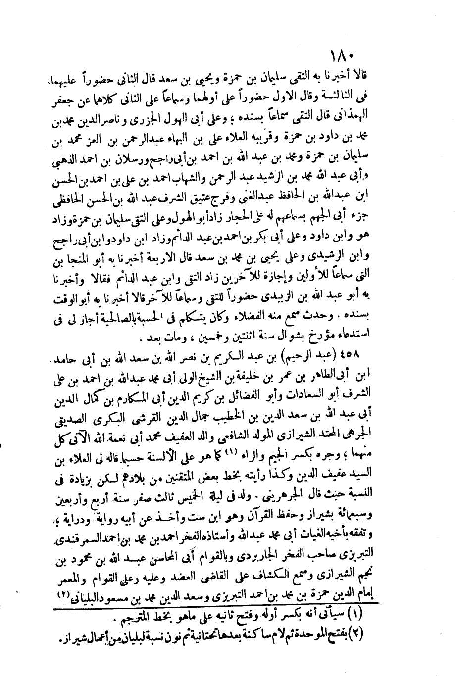 قَالَا أخبرنَا بِهِ التقي سُلَيْمَان بن حَمْزَة وَيحيى بن سعد قَالَ الثَّانِي حضورا عَلَيْهِمَا فِي الثَّالِثَة وَقَالَ الأول حضورا على أَولهمَا وسماعا على الثَّانِي كِلَاهُمَا عَن جَعْفَر الهمذاني قَالَ التقي سَمَاعا بِسَنَدِهِ وعَلى أبي الهول الْجَزرِي وناصر الدّين مُحَمَّد بن مُحَمَّد بن دَاوُد بن حَمْزَة وقريبه الْعَلَاء عَليّ بن الْبَهَاء عبد الرَّحْمَن بن الْعِزّ مُحَمَّد بن سُلَيْمَان بن حَمْزَة وَمُحَمّد بن عبد الله بن أَحْمد بن أبي رَاجِح ورسلان بن أَحْمد الذَّهَبِيّ وَأبي عبد الله مُحَمَّد بن الرشيد عبد الرَّحْمَن والشهاب أَحْمد بن عَليّ بن أَحْمد بن الْحسن ابْن عبد الله بن الْحَافِظ عبد الْغَنِيّ وَفرج عَتيق الشّرف عبد الله بن الْحسن الحافظي جُزْء أبي الجهم بسماعهم لَهُ على الْحجاز زَاد أَبُو الهول وعَلى التقي سُلَيْمَان بن حَمْزَة وَزَاد هُوَ وَابْن دَاوُد وعَلى أبي بكر بن أَحْمد بن عبد الدَّائِم وَزَاد ابْن دَاوُد وَابْن أبي رَاجِح وَابْن الرَّشِيدِيّ وعَلى يحيى بن مُحَمَّد بن سعد قَالَ الْأَرْبَعَة أخبرنَا بِهِ أَبُو المنجا بن الَّتِي سَمَاعا للأولين وإجازة للآخرين زَاد التقي وَابْن عبد الدَّائِم فَقَالَا وَأخْبرنَا بِهِ أَبُو عبد الله بن الزبيدِيّ حضورا للتقي وسماعا للْآخر قَالَا أخبرنَا بِهِ أَبُو الْوَقْت بِسَنَدِهِ، وَحدث سمع مِنْهُ الْفُضَلَاء وَكَانَ يتَكَلَّم فِي الْحِسْبَة بالصالحية أجَاز لي فِي استدعاء مؤرخ بشوال سنة اثْنَتَيْنِ وَخمسين، وَمَات بعد.
