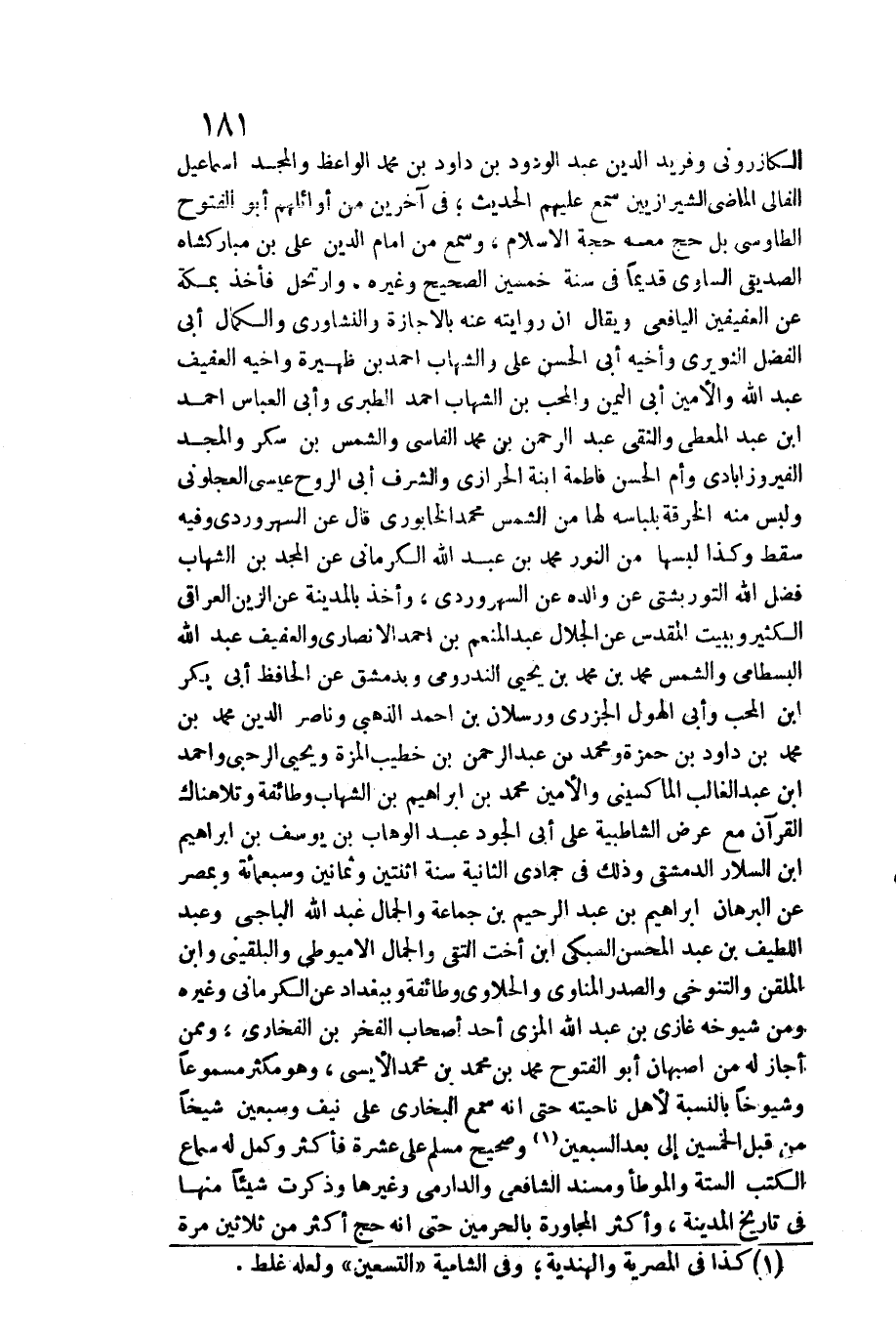 الكازروني وفريد الدّين عبد الْوَدُود بن دَاوُد بن مُحَمَّد الْوَاعِظ وَالْمجد إِسْمَاعِيل الفالي / الْمَاضِي الشيرازيين سمع عَلَيْهِم الحَدِيث فِي آخَرين من أوائلهم أَبُو الْفتُوح الطاوسي بل حج مَعَه حجَّة الاسلام، وَسمع من إِمَام الدّين عَليّ بن مباركشاه الصديقي الساوي قَدِيما فِي سنة خمسين الصَّحِيح وَغَيره، وارتحل فَأخذ بِمَكَّة عَن العفيفين اليافعي وَيُقَال إِن رِوَايَته عَنهُ بالاجازة والنشاوري والكمال أبي الْفضل النويري وأخيه أبي الْحسن عَليّ والشهاب أَحْمد بن ظهيرة وأخيه الْعَفِيف عبد الله والأمين أبي الْيمن والمحب بن الشهَاب أَحْمد الطَّبَرِيّ وَأبي الْعَبَّاس أَحْمد ابْن عبد الْمُعْطِي والتقي عبد الرَّحْمَن بن مُحَمَّد الفاسي وَالشَّمْس بن سكر وَالْمجد الفيروزابادي وَأم الْحسن فَاطِمَة ابْنة الْحرَازِي والشرف أبي الرّوح عِيسَى العجلوني وَلبس مِنْهُ الْخِرْقَة بلباسه لَهَا من الشَّمْس مُحَمَّد الخابوري قَالَ عَن السهروردي وَفِيه سقط وَكَذَا لبسهَا من النُّور مُحَمَّد بن عبد الله الْكرْمَانِي عَن الْمجد بن الشهَاب فضل الله التوربشتي عَن وَالِده عَن السهروردي، وَأخذ بِالْمَدِينَةِ عَن الزين الْعِرَاقِيّ الْكثير وببيت الْمُقَدّس عَن الْجلَال عبد الْمُنعم بن أَحْمد الْأنْصَارِيّ والعفيف عبد الله البسطامي وَالشَّمْس مُحَمَّد بن مُحَمَّد بن يحيى الندرومي وبدمشق عَن الْحَافِظ أبي بكر ابْن الْمُحب وَأبي الهول الْجَزرِي ورسلان بن أَحْمد الذَّهَبِيّ وناصر الدّين مُحَمَّد بن مُحَمَّد بن دَاوُد بن حَمْزَة وَمُحَمّد بن عبد الرَّحْمَن بن خطيب المزة وَيحيى الرَّحبِي وَأحمد ابْن عبد الْغَالِب الماكسيني والأمين مُحَمَّد بن إِبْرَاهِيم بن الشهَاب وَطَائِفَة وتلا هُنَاكَ الْقُرْآن مَعَ عرض الشاطبية على أبي الْجُود عبد الْوَهَّاب بن يُوسُف بن إِبْرَاهِيم ابْن السلار الدِّمَشْقِي وَذَلِكَ فِي جُمَادَى الثَّانِيَة سنة اثْنَتَيْنِ وَثَمَانِينَ وَسَبْعمائة وبمصر عَن الْبُرْهَان إِبْرَاهِيم بن عبد الرَّحِيم بن جمَاعَة وَالْجمال عبد الله الْبَاجِيّ وَعبد اللَّطِيف بن عبد المحسن السُّبْكِيّ ابْن أُخْت التقي وَالْجمال الاميوطي والبلقيني وَابْن الملقن والتنوخي والصدر الْمَنَاوِيّ والحلاوي وَطَائِفَة وببغداد عَن الْكرْمَانِي وَغَيره وَمن شُيُوخه غَازِي بن عبد الله الْمزي أحد أَصْحَاب الْفَخر بن الفخاري، وَمِمَّنْ أجَاز لَهُ من أَصْبَهَان أَبُو الْفتُوح مُحَمَّد بن مُحَمَّد بن مُحَمَّد الأيسي، وَهُوَ مكثر مسموعا وشيوخا بِالنِّسْبَةِ لأهل ناحيته حَتَّى انه سمع البُخَارِيّ على نَيف وَسبعين شَيخا من قبل الْخمسين إِلَى بعد السّبْعين وصحيح مُسلم على عشرَة فَأكْثر وكمل لَهُ سَماع الْكتب السِّتَّة والموطأ ومسند الشَّافِعِي والدارمي وَغَيرهَا وَذكرت شَيْئا مِنْهَا فِي تَارِيخ)