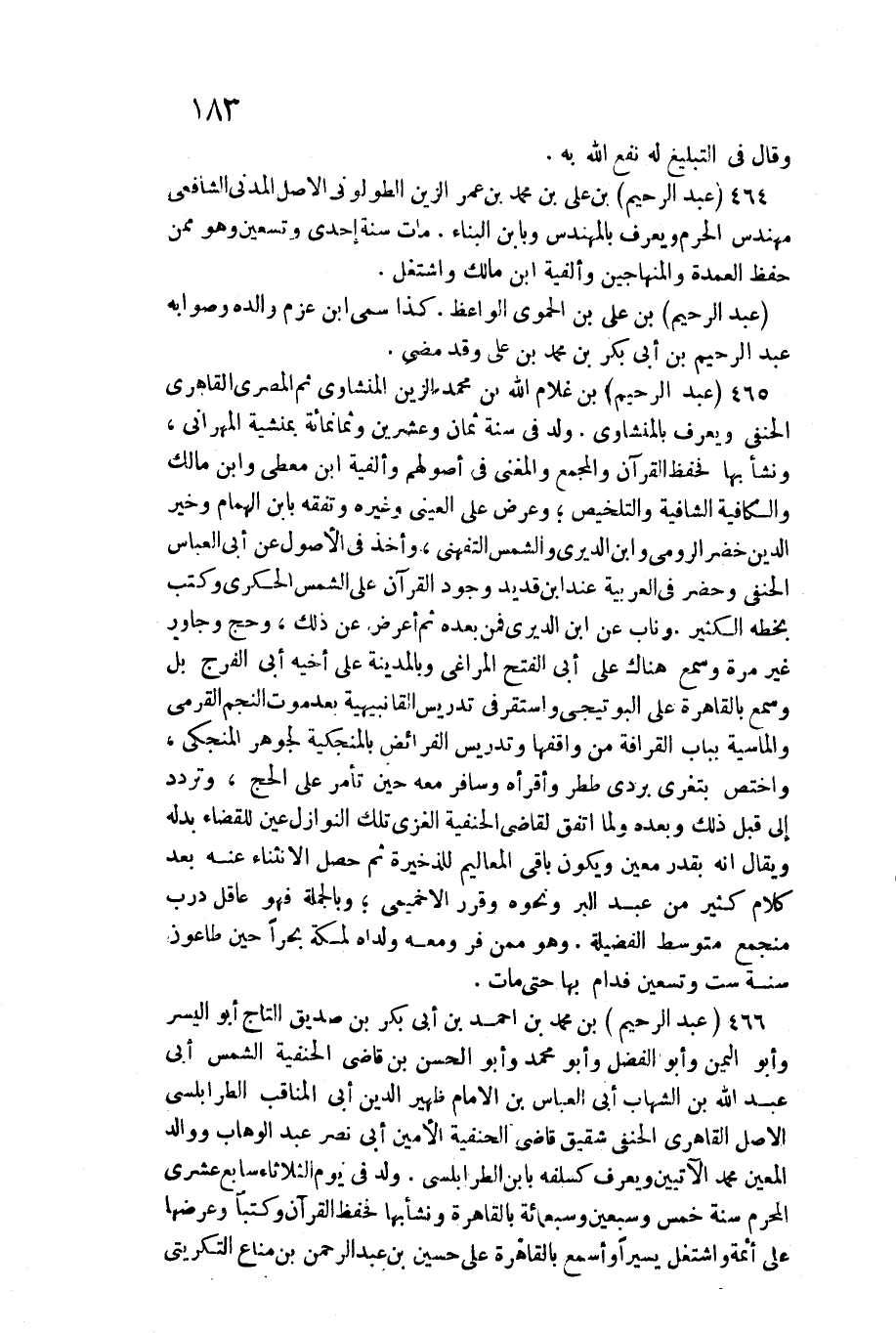 465 - عبد الرَّحِيم بن غُلَام الله بن مُحَمَّد الزين المنشاوي ثمَّ الْمصْرِيّ القاهري الْحَنَفِيّ وَيعرف بالمنشاوي. / ولد فِي سنة ثَمَان وَعشْرين وَثَمَانمِائَة بمنشية المهراني، وَنَشَأ بهَا فحفظ الْقُرْآن وَالْمجْمَع وَالْمُغني فِي أصولهم وألفية ابْن معطي وَابْن مَالك والكافية الشافية وَالتَّلْخِيص وَعرض على الْعَيْنِيّ وَغَيره وتفقه بِابْن الْهمام وَخير الدّين خضر الرُّومِي وَابْن الديري وَالشَّمْس التفهني، وَأخذ فِي الْأُصُول عَن أبي الْعَبَّاس الْحَنَفِيّ وَحضر فِي الْعَرَبيَّة عِنْد ابْن قديد وجود الْقُرْآن على الشَّمْس الحكري وَكتب بِخَطِّهِ الْكثير. وناب عَن ابْن الديري فَمن بعده ثمَّ أعرض عَن ذَلِك، وَحج وجاور غير مرّة وَسمع هُنَاكَ على أبي الْفَتْح المراغي وبالمدينة على أَخِيه أبي الْفرج بل وَسمع بِالْقَاهِرَةِ على البوتيجي وَاسْتقر فِي تدريس القانبيهية بعد موت النَّجْم القرمي والماسية بِبَاب القرافة من واقفها وتدريس الْفَرَائِض بالمنجكية لجوهر المنجكي، واختص بتغري بردى ططر وأقرأه وسافر مَعَه حِين تَأمر على الْحَج، وَتردد إِلَى قبل ذَلِك وَبعده وَلما انفق لقَاضِي الْحَنَفِيَّة الْغَزِّي تِلْكَ النَّوَازِل عين للْقَضَاء بدله وَيُقَال أَنه بِقدر معِين وَيكون بَاقِي المعاليم للذخيرة ثمَّ حصل الانثناء عَنهُ بعد كَلَام كثير من عبد الْبر وَنَحْوه وَقرر الأخميمي وَبِالْجُمْلَةِ فَهُوَ عَاقل درب منجمع متوسط الْفَضِيلَة. وَهُوَ مِمَّن فر وَمَعَهُ ولداه لمَكَّة بحرا حِين طاعون سنة سِتّ وَتِسْعين فدام بهَا حَتَّى مَاتَ.