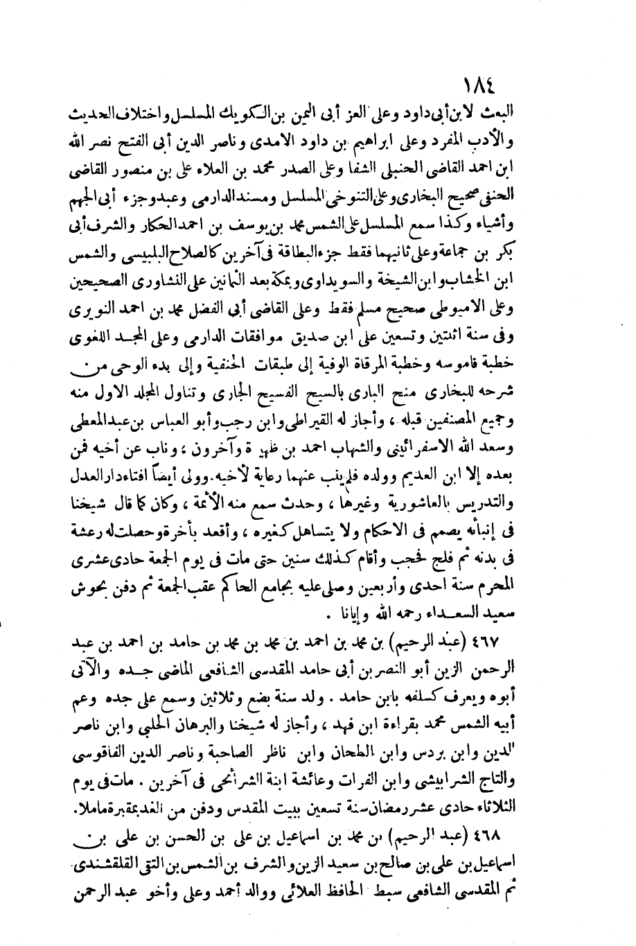 467 - عبد الرَّحِيم بن مُحَمَّد بن أَحْمد بن مُحَمَّد بن مُحَمَّد بن حَامِد بن أَحْمد بن عبد الرَّحْمَن الزين أَبُو النَّصْر بن أبي حَامِد الْمَقْدِسِي الشَّافِعِي / الْمَاضِي جده والآتي أَبوهُ وَيعرف كسلفه بِابْن حَامِد. ولد سنة بضع وَثَلَاثِينَ وَسمع على جده وَعم أَبِيه الشَّمْس مُحَمَّد بِقِرَاءَة ابْن فَهد، وَأَجَازَ لَهُ شَيخنَا والبرهان الْحلَبِي وَابْن نَاصِر الدّين وَابْن بردس وَابْن الطَّحَّان وَابْن نَاظر الصَّحَابَة وناصر الدّين الفاقوسي والتاج الشرابيشي وَابْن الْفُرَات وَعَائِشَة وَابْنَة الشرائحي فِي آخَرين. مَاتَ فِي يَوْم الثُّلَاثَاء حادي عشر رَمَضَان سنة تسعين بِبَيْت الْمُقَدّس وَدفن من الْغَد بمقبرة ماملا.