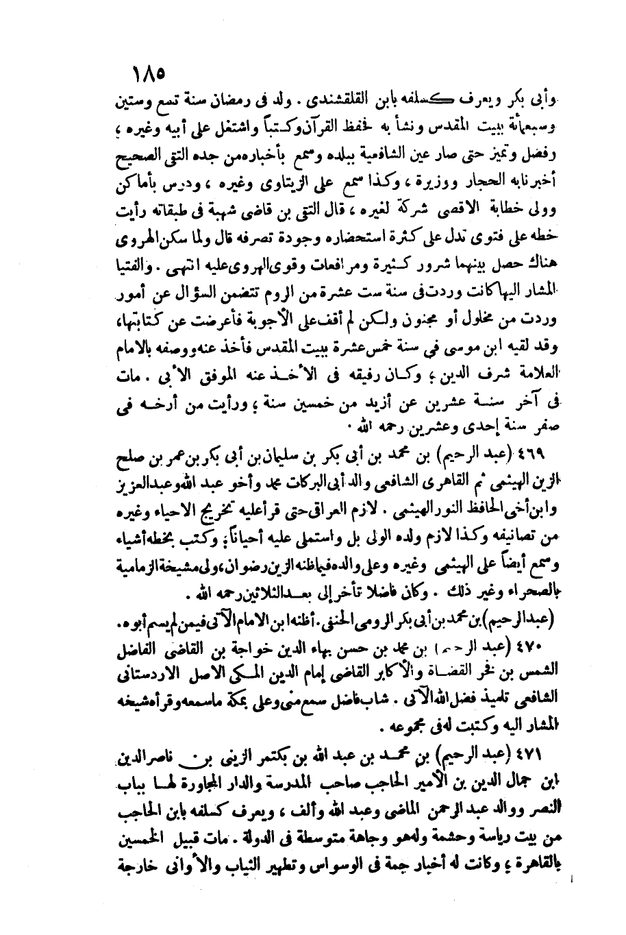 469 - عبد الرَّحِيم بن مُحَمَّد بن أبي بكر بن سُلَيْمَان بن أبي بكر بن عمر بن صلح الزين الهيثمي ثمَّ القاهري الشَّافِعِي وَالِد أبي البركات مُحَمَّد وأخو عبد الله وَعبد الْعَزِيز وَابْن أخي الْحَافِظ النُّور الهيثمي /. لَازم الْعِرَاقِيّ حَتَّى قَرَأَ عَلَيْهِ تَخْرِيج الْأَحْيَاء وَغَيره من تصانيفه وَكَذَا لَازم وَلَده الْوَلِيّ بل واستملى عَلَيْهِ أَحْيَانًا وَكتب بِخَطِّهِ أَشْيَاء وَسمع أَيْضا على الهيثمي وَغَيره وعَلى وَالِده فِيمَا ظَنّه الزين رضوَان، ولي مشيخة الزمامية بالصحراء وَغير ذَلِك. وَكَانَ فَاضلا تَأَخّر إِلَى بعد الثَّلَاثِينَ رَحمَه الله.