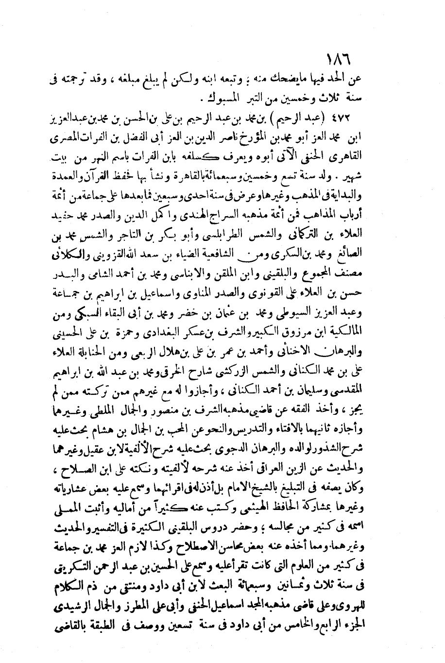 472 - عبد الرَّحِيم بن مُحَمَّد بن عبد الرَّحِيم بن عَليّ بن الْحسن بن مُحَمَّد بن عبد الْعَزِيز ابْن مُحَمَّد الْعِزّ أَبُو مُحَمَّد بن المؤرخ نَاصِر الدّين بن الْعِزّ أبي الْفضل بن الْفُرَات الْمصْرِيّ القاهري الْحَنَفِيّ / الْآتِي أَبوهُ وَيعرف كسلفه بِابْن الْفُرَات باسم النَّهر من بَيت شهير. ولد سنة تسع وَخمسين وَسَبْعمائة بِالْقَاهِرَةِ وَنَشَأ بهَا فحفظ الْقُرْآن والعمدة والبداية فِي الْمَذْهَب وَغَيرهَا وَعرض فِي سنة إِحْدَى وَسبعين فَمَا بعْدهَا على جمَاعَة من أَئِمَّة أَرْبَاب الْمذَاهب فَمن أَئِمَّة مذْهبه السراج الْهِنْدِيّ وأكمل الدّين والصدر مُحَمَّد حفيد الْعَلَاء بن التركماني وَالشَّمْس الطرابلسي وَأَبُو بكر بن التَّاجِر وَالشَّمْس مُحَمَّد بن الصَّائِغ وَمُحَمّد بن السكرِي وَمن الشَّافِعِيَّة الضياء بن سعد الله الْقزْوِينِي والكلائي مُصَنف الْمَجْمُوع والبلقيني وَابْن الملقن والابناسي وَمُحَمّد بن أَحْمد الشَّامي والبدر حسن بن الْعَلَاء عَليّ القونوي والصدر الْمَنَاوِيّ وَإِسْمَاعِيل بن إِبْرَاهِيم بن جمَاعَة وَعبد الْعَزِيز السُّيُوطِيّ وَمُحَمّد بن عُثْمَان بن خضر وَمُحَمّد بن أبي الْبَقَاء السُّبْكِيّ وَمن الْمَالِكِيَّة ابْن مَرْزُوق الْكَبِير والشرف بن عَسْكَر الْبَغْدَادِيّ وَحَمْزَة بن عَليّ الْحُسَيْنِي والبرهان الاخنائي وَأحمد بن عمر بن عَليّ بن هِلَال الربعِي وَمن الْحَنَابِلَة الْعَلَاء عَليّ بن مُحَمَّد الْكِنَانِي وَالشَّمْس الزَّرْكَشِيّ شَارِح الْخرقِيّ وَمُحَمّد بن عبد الله بن إِبْرَاهِيم الْمَقْدِسِي وَسليمَان بن أَحْمد الْكِنَانِي، وأجازوا لَهُ مَعَ غَيرهم مِمَّن تركته مِمَّن لم يجز، وَأخذ الْفِقْه عَن قَاضِي مذْهبه الشّرف بن مَنْصُور وَالْجمال الْمَلْطِي وَغَيرهمَا وَأَجَازَهُ ثَانِيهمَا بالافتاء والتدريس والنحو عَن الْمُحب بن الْجمال بن هِشَام بحث عَلَيْهِ شرح الشذور لوالده والبرهان الدجوي بحث عَلَيْهِ شرح الألفية لِابْنِ عقيل وَغَيرهمَا والْحَدِيث عَن الزين الْعِرَاقِيّ أَخذ عَنهُ شَرحه لألفيته ونكته على ابْن الصّلاح، وَكَانَ يصفه فِي التَّبْلِيغ بالشيخ الإِمَام بل أذن لَهُ فِي)