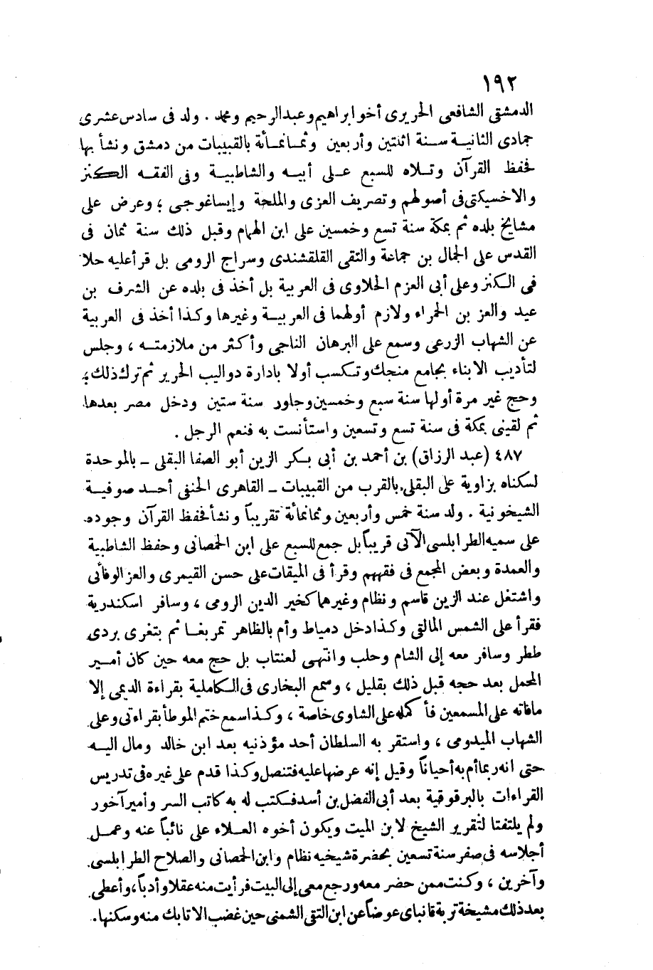 487 - عبد الرَّزَّاق بن أَحْمد بن أبي بكر الزين أَبُو الصَّفَا البقلي بِالْمُوَحَّدَةِ / لسكناه بزاوية عَليّ البقلي. بِالْقربِ من القبيبات القاهري الْحَنَفِيّ أحد صوفية الشيخونية. ولد سنة خمس وَأَرْبَعين وَثَمَانمِائَة تَقْرِيبًا وَنَشَأ فحفظ الْقُرْآن وجوده على سميه الطرابلسي الْآتِي قَرِيبا بل جمع للسبع على ابْن الحمصاني وَحفظ الشاطبية والعمدة وَبَعض الْمجمع فِي فقههم وَقَرَأَ فِي الْمِيقَات على حسن القميري والعز الوفائي واشتغل عِنْد الزين قَاسم ونظام وَغَيرهمَا كخير الدّين الرُّومِي، وسافر اسكندرية فَقَرَأَ على الشَّمْس المالقي وَكَذَا دخل دمياط وَأم بِالظَّاهِرِ تمربغا ثمَّ بتغري بردى ططر وسافر مَعَه إِلَى الشَّام وحلب وانْتهى لعنتاب بل حج مَعَه حِين كَانَ أَمِير الْمَحْمِلِيُّ بعد حج قبل ذَلِك بِقَلِيل، وَسمع البُخَارِيّ فِي الكاملية بِقِرَاءَة الديمي إِلَّا مَا فَاتَهُ على المسمعين فأكمله على الشاوي خَاصَّة، وَكَذَا سمع ختم الْمُوَطَّأ بِقِرَاءَتِي وعَلى الشهَاب الْمَيْدُومِيُّ، وَاسْتقر بِهِ السُّلْطَان أحد مؤذنيه بعد ابْن خَالِد وَمَال إِلَيْهِ حَتَّى انه رُبمَا أم بِهِ أَحْيَانًا وَقيل إِنَّه عرضهَا عَلَيْهِ فتنصل وَكَذَا قدم على غَيره فِي تدريس الْقرَاءَات بالبرقوقية بعد أبي الْفضل بن أَسد فَكتب لَهُ بِهِ كَاتب السِّرّ وأميرآخور وَلم يلتفتا لتقرير الشَّيْخ لِابْنِ الْمَيِّت وَيكون أَخُوهُ الْعَلَاء عَليّ نَائِبا عَنهُ وَعمل أجلاسه فِي صفر سنة تسعين بِحَضْرَة شيخيه نظام وَابْن الحمصاني وَالصَّلَاح الطرابلسي وَآخَرين، وَكنت مِمَّن حضر مَعَه وَرجع معي إِلَى الْبَيْت فَرَأَيْت مِنْهُ عقلا وأدبا، وَأعْطى بعد ذَلِك مشيخة تربة قانباي عوضا عَن ابْن التقي الشمني حِين غضب الاتابك مِنْهُ وسكنها.