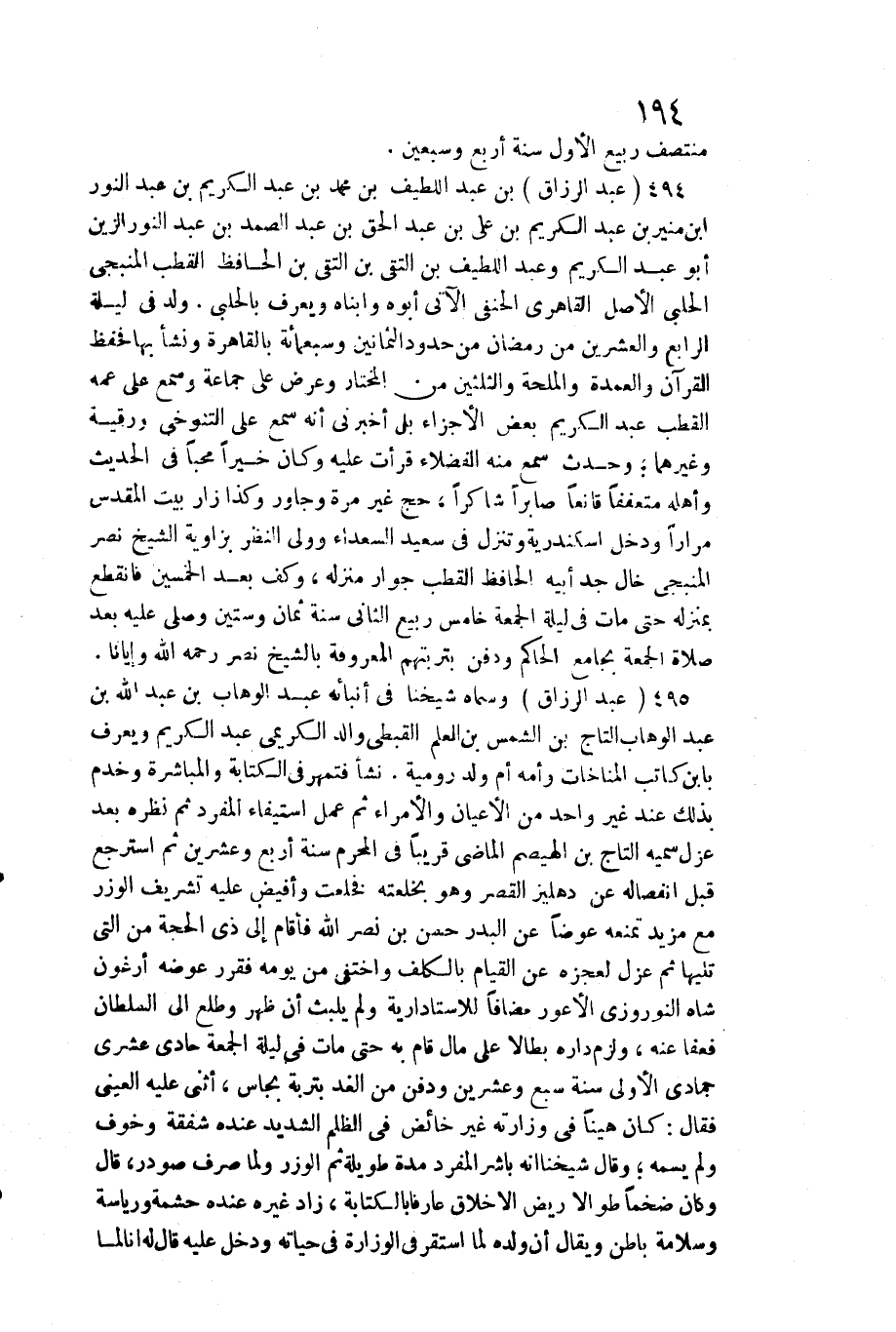 494 -. عبد الرَّزَّاق بن عبد اللَّطِيف بن مُحَمَّد بن عبد الْكَرِيم بن عبد النُّور ابْن مُنِير بن عبد الْكَرِيم بن عَليّ بن عبد الْحق بن عبد الصَّمد بن عبد النُّور الزين أَبُو عبد الْكَرِيم وَعبد اللَّطِيف بن التقي بن التقي بن الْحَافِظ القطب المنبجي الْحلَبِي الأَصْل القاهري الْحَنَفِيّ / الْآتِي أَبوهُ وابناه وَيعرف بالحلبي. ولد فِي لَيْلَة الرَّابِع وَالْعِشْرين من رَمَضَان من حُدُود الثَّمَانِينَ وَسَبْعمائة بِالْقَاهِرَةِ وَنَشَأ بهَا فحفظ الْقُرْآن والعمدة والملحة والثلثين من الْمُخْتَار وَعرض على جمَاعَة)