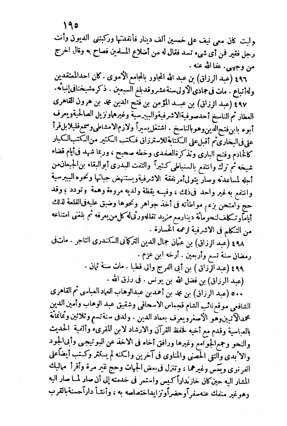 496 - عبد الرَّزَّاق بن عبد الله / المجاور بالمجامع الْأمَوِي. كَانَ أحد المعتقلين وَله أَتبَاع. مَاتَ فِي جُمَادَى الأولى سنة عشر وَقد بلغ السّبْعين. ذكره شَيخنَا فِي إنبائه.) (سقط)