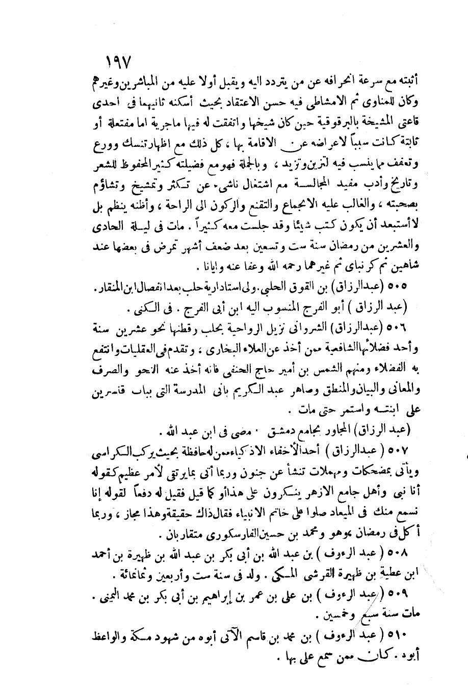 507 - عبد الرَّزَّاق / أحد الأخفاء الاذكياء مِمَّن لَهُ حافظة بِحَيْثُ يركب الكراسي وَيَأْتِ بمضحكات ومهملات تنشأ عَن جُنُون وَرُبمَا أَتَى بِمَا يرتقي لأمر عَظِيم كَقَوْلِه أَنا نَبِي وَأهل جَامع الْأَزْهَر يُنكرُونَ على هَذَا أَو كَمَا قيل فَقيل لَهُ دفعا لقَوْله إِنَّا نسْمع مِنْك فِي الميعاد صلوا على خَاتم الْأَنْبِيَاء فَقَالَ ذَاك حَقِيقَة وَهَذَا مجَاز، وَرُبمَا أكل فِي رَمَضَان، وَهُوَ وَمُحَمّد بن حُسَيْن الفارسكوري متقاربان.