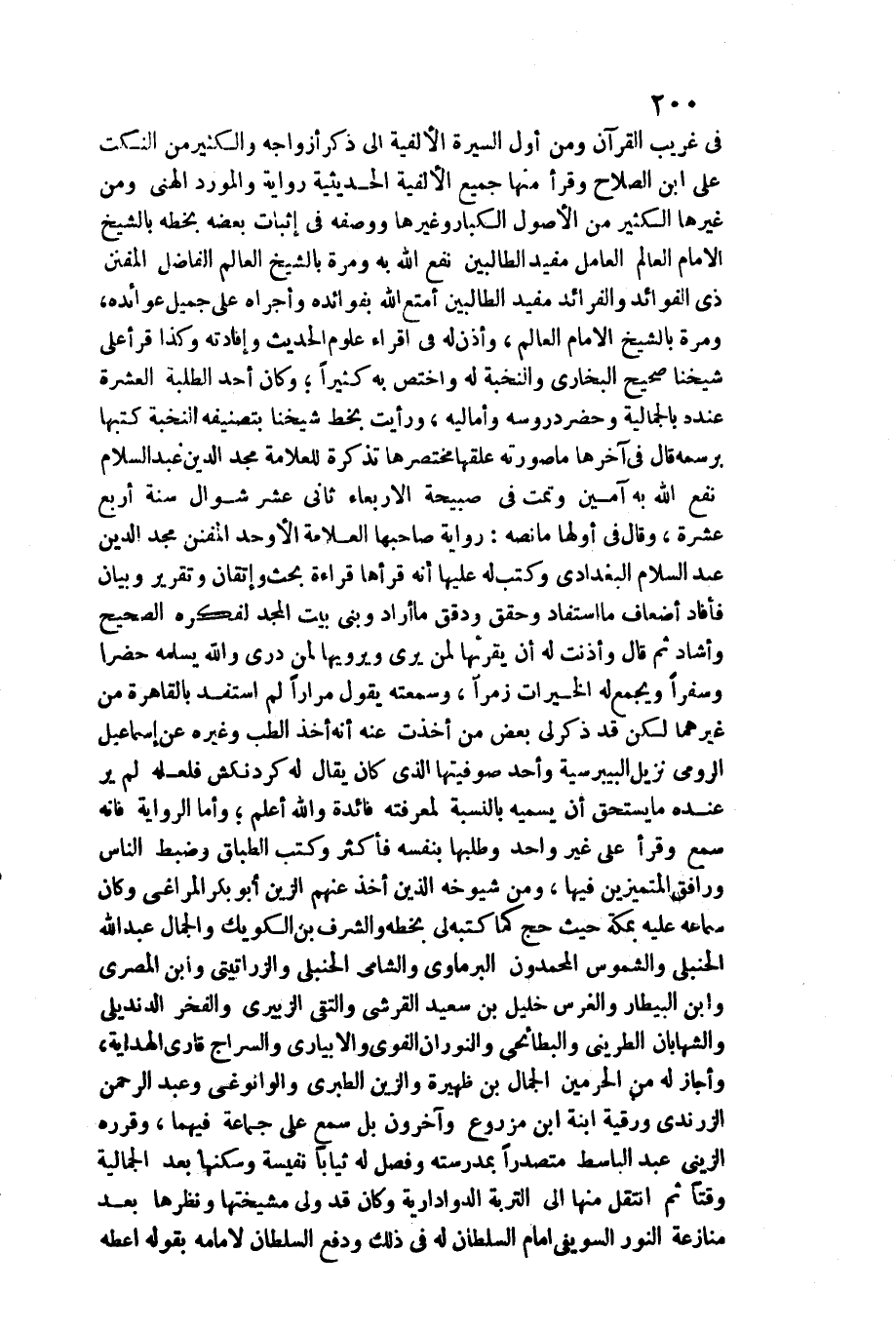 ابْن الصّلاح وَقَرَأَ مِنْهَا جَمِيع الألفية الحديثية رِوَايَة والمورد الهني وَمن غَيرهَا الْكثير من الْأُصُول الْكِبَار وَغَيرهَا وَوَصفه فِي إِثْبَات بعضه بِخَطِّهِ بالشيخ الإِمَام الْعَالم الْعَامِل مُفِيد الطالبين نفع الله بِهِ وَمرَّة بالشيخ الْعَالم الْفَاضِل المفنن ذِي الْفَوَائِد والفرائد مُفِيد الطالبين أمتع الله بفوائده وأجراه على جميل عوائده، وَمرَّة بالشيخ الإِمَام الْعَالم، وَأذن لَهُ فِي إقراء عُلُوم الحَدِيث وإفادته وَكَذَا قَرَأَ على شَيخنَا صَحِيح البُخَارِيّ والنخبة لَهُ واختص بِهِ كثيرا وَكَانَ أحد الطّلبَة الْعشْرَة عِنْده بالجمالية وَحضر دروسه وأماليه، وَرَأَيْت بِخَط شَيخنَا بتصنيفه النخبة كتبهَا برسمه قَالَ فِي آخرهَا مَا صورته علقها مختصرها تذكرة للعلامة مجد الدّين عبد السَّلَام نفع الله بِهِ آمين وتمت فِي صَبِيحَة الاربعاء ثَانِي عشر شَوَّال سنة أَربع عشرَة، وَقَالَ فِي أَولهَا مَا نَصه: رِوَايَة صَاحبهَا الْعَلامَة الأوحد المفنن مجد الدّين عبد السَّلَام الْبَغْدَادِيّ وَكتب لَهُ عَلَيْهَا أَنه قَرَأَهَا قِرَاءَة بحث وإتقان وَتَقْرِير وَبَيَان فَأفَاد أَضْعَاف مَا اسْتَفَادَ وحقق ودقق مَا أَرَادَ وَبنى بَيت الْمجد لفكره الصَّحِيح وأشاد ثمَّ قَالَ وَأذن لَهُ أَن يقرئها لمن يرى ويرويها لمن درى وَالله يُسلمهُ حضرا وسفرا وَيجمع لَهُ الْخيرَات زمرا، وسمعته يَقُول مرَارًا لم أستفد بِالْقَاهِرَةِ من غَيرهمَا لَكِن قد ذكر لي بعض من أخذت عَنهُ أَنه أَخذ الطِّبّ وَغَيره عَن إِسْمَاعِيل الرُّومِي نزيل البيبرسية وَأحد صوفيتها الَّذِي كَانَ يُقَال لَهُ كردنكش فَلَعَلَّهُ لم ير عِنْده مَا يسْتَحق أَن يُسَمِّيه بِالنِّسْبَةِ لمعرفته فَائِدَة وَالله أعلم وَأما الرِّوَايَة فنه سمع وَقَرَأَ على غير وَاحِد وطلبها بِنَفسِهِ فَأكْثر وَكتب الطباق وَضبط النَّاس ورافق المتميزين فِيهَا، وَمن شُيُوخه الَّذين أَخذ عَنْهُم الزين أَبُو بكر المراغي وَكَانَ سَمَاعه عَلَيْهِ بِمَكَّة حَيْثُ حج كَمَا كتبه لي بِخَطِّهِ والشرف بن الكويك وَالْجمال عبد الله الْحَنْبَلِيّ والشموس المحمدون الْبرمَاوِيّ والشامي الْحَنْبَلِيّ والزارتيتي وَابْن الْمصْرِيّ وَابْن البيطار وَالْغَرْس خَلِيل بن سعيد الْقرشِي والتقي الزبيرِي وَالْفَخْر الدنديلي والشهابان الطريني والبطائحي والنوران الفوي والابياري والسراج قاري الْهِدَايَة، وَأَجَازَ ل من الْحَرَمَيْنِ الْجمال بن ظهيرة والزين الطَّبَرِيّ والوانوغي وَعبد الرَّحْمَن الزرندي ورقية ابْنة ابْن مزروع وَآخَرُونَ بل سمع على جمَاعَة فيهمَا، وَقَررهُ الزيني عبد الباسط متصدرا بمدرسته وَفصل لَهُ ثيابًا نفيسة وسكنها بعد الجمالية وقتا ثمَّ انْتقل مِنْهَا إِلَى التربة الدوادارية وَكَانَ قد ولي مشيختها ونظرها بعد مُنَازعَة النُّور السويفي أَمَام السُّلْطَان لَهُ فِي ذَلِك وَدفع السُّلْطَان لامامه بقوله أعْطه