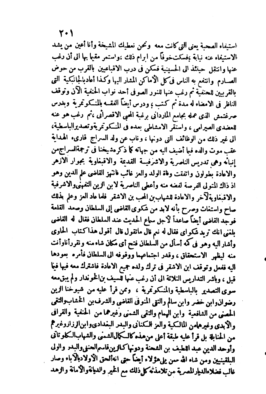 يشد الِاسْتِيفَاء عَنهُ نِيَابَة فَسكت خوفًا من ابرام ذَلِك، وَاسْتمرّ مُقيما بهَا إِلَى أَن رغب عَنْهَا وانتقل حِينَئِذٍ إِلَى الحسينية فسكن فِي درب الاقباعيين بِالْقربِ من حَوْض الصارم وانتفع بِهِ النَّاس فِي كل الْأَمَاكِن الْمشَار إِلَيْهَا وَكَذَا أعَاد بالجانبكية الَّتِي بالقربيين للحنفية ثمَّ رغب عَنْهَا للنور الصُّوفِي أحد نواب الْحَنَفِيَّة الْآن وَتوقف النَّاظر فِي الامضاء لَهُ مُدَّة ثمَّ كتب ودرس أَيْضا الْفِقْه بالمنكوتمرية وبدرس صرغتمش الَّذِي عمله بِجَامِع المارداني برغبة المحبي الاقصرائي، ثمَّ رغب هُوَ عَنهُ للعضدي الصيرامي، وَاسْتقر الامشاطي بعده فِي المنكوتمرية وتصدير الباسطية، إِلَى غير ذَلِك من الْوَظَائِف الَّتِي دونهَا، وناب عَن ولد السراج قارىء الْهِدَايَة عقب موت وَالِده فِيمَا أضيف إِلَيْهِ من جهاته كَمَا ذكره شَيخنَا فِي تَرْجَمَة السراج من إنبائه وَهِي تدريس الناصرية والاشرفية الْقَدِيمَة والاقبغاوية بجوار الازهر والاعادة بطولون واتفقت وَفَاة الْوَلَد والعز غَائِب فانتهز القَاضِي علم الدّين وَهُوَ إِذْ ذَاك الْمُتَوَلِي الفرصة لفضه مِنْهُ وَأعْطى الناصرية لِابْنِ الزين التفهني والاشرفية والاقبغاوية لآخر والاعادة لِلشِّهَابِ بن الْمُحب بن الاشقر فَلَمَّا عَاد الْعِزّ وَعلم بذلك صَاح واستغاث وَصرح بِأَنَّهُ لَا بُد من شكوى القَاضِي إِلَى السُّلْطَان وَصعد القلعة فَوجدَ القَاضِي أَيْضا صاعدا لأجل سَماع الحَدِيث عِنْد السُّلْطَان فَقَالَ لَهُ القَاضِي بَلغنِي أَنَّك تُرِيدُ شكواك فَقَالَ لَهُ نعم قَالَ مَا تَقول قَالَ أَقُول هَذَا كتاب الْحَاوِي وَأَشَارَ إِلَيْهِ وَهُوَ فِي كمه أسأَل من السُّلْطَان فتح أَي مَكَان شَاءَ مِنْهُ ونقرر أَنا وَأَنت مِنْهُ ليظْهر الِاسْتِحْقَاق، وَقدر اجتماعها ووقوفه إِلَى السُّلْطَان فَأمره بعودها إِلَيْهِ فَفعل وَتوقف ابْن الْأَشْقَر فِي ترك وَلَده جَمِيع الاعادة فاشترك مَعَه فِيهَا فِيمَا قيل، وباشر التداريس الثَّلَاثَة إِلَى أَن رغب عَنْهَا للسيف بن الخوندار وَلم يبْق مَعَه سوى التصدير بالباسطية والمنكوتمرية، وَمِمَّنْ قَرَأَ عَلَيْهِ من شُيُوخنَا الزين رضوَان وَابْن خضر وَابْن سَالم والتقي المنوفي القَاضِي والشرف بن الخشاب والتقي الحصني من الشَّافِعِيَّة وَابْن الْهمام والتقي الشمني وَغَيرهمَا من الْحَنَفِيَّة والقرافي والأبدي وَغَيرهمَا من الْمَالِكِيَّة والعز الْكِنَانِي والبدر الْبَغْدَادِيّ وَابْن الرزاز وَغَيرهم من الْحَنَابِلَة بل قَرَأَ عَلَيْهِ طبقَة أَعلَى من هَذِه كالكمال الشمني والشهاب الكلوتاتي وأوحد الدّين عبد اللَّطِيف بن الشّحْنَة ودونها كالزين قَاسم الْحَنَفِيّ والبدر وَالْوَلِيّ البلقينيين وَمن شَاءَ الله مِمَّن يَلِي هَؤُلَاءِ أَيْضا حَتَّى أَنه ألحق الْأَوْلَاد بِالْآبَاءِ وَصَارَ غَالب فضلاء الديار المصرية من تلامذته كل ذَلِك مَعَ الْخَيْر والديانة وَالْأَمَانَة والزهد
