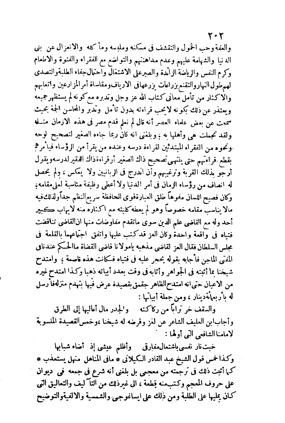 وملبسه ومأكله والانعزال عَن بني الدُّنْيَا والشهامة عَلَيْهِم وَعدم مداهنتهم والتواضع مَعَ الْفُقَرَاء والفتوة والاطعام وكرم النَّفس والرياضة الزَّائِدَة وَالصَّبْر على الِاشْتِغَال وَاحْتِمَال جفَاء الطّلبَة والتصدي لَهُم طول النَّهَار والتقنع بزراعات يَزْرَعهَا فِي الأرياف ومقاساة أَمر المزارعين واتعابهم والاكثار من تَأمل مَعَاني كتاب الله عز وَجل وتدبره مَعَ كَونه لم يستظهر جَمِيعه وَيعْتَذر عَن ذَلِك بِكَوْنِهِ لَا يحب قِرَاءَته بِدُونِ تَأمل وتدبر والمحاسن الجمة بِحَيْثُ سَمِعت عَن بعض عُلَمَاء الْعَصْر أَنه قَالَ لم نعلم قدم مصر فِي هَذِه الْأَزْمَان مثله وَلَقَد تجملت هِيَ وَأَهْلهَا بِهِ وَبَلغنِي أَنه كَانَ رُبمَا جَاءَهُ الصَّغِير لتصحيح لوحه وَنَحْوه من الْفُقَرَاء المبتدئين لقِرَاءَة درسه وَعِنْده من يقْرَأ من الرؤساء فيأمرهم بِقطع قراءتهم حَتَّى يَنْتَهِي تَصْحِيح ذَاك الصَّغِير أَو قِرَاءَة ذَاك الْفَقِير لدرسه وَيَقُول أَرْجُو بذلك الْقرْبَة وترغيبهم وَأَن اندرج فِي الربانيين وَلَا يعكس، وَلم يحصل لَهُ انصاف من رُؤَسَاء الزَّمَان فِي أَمر الدُّنْيَا وَلَا أعْطى وَظِيفَة مُنَاسبَة لعَلي مقَامه وَكَانَ فصيح اللِّسَان مفوها طلق الْعبارَة قوي الحافظة سريع النّظم جدا وَلذَلِك فِيهِ مَالا يُنَاسب مقَامه خُصُوصا وَهُوَ لم يُعْطه كليته مَعَ إكثاره مِنْهُ لَا يهاب كَبِير أحد وَله مَعَ القَاضِي علم الدّين سوى مَا تقدم مفاوضات مِنْهَا ان القَاضِي تناقضت فتياه فِي وَاقعَة وَاحِدَة وَكَانَ الْعِزّ قد كتب عَلَيْهَا وَاتفقَ اجْتِمَاعهمَا بالقلعة فِي مجْلِس السُّلْطَان فَقَالَ الْعِزّ لقَاضِي مذْهبه يَا مَوْلَانَا قَاضِي الْقُضَاة مَا الحكم عندنَا فِي الْمُفْتِي الماجين فَأَجَابَهُ بقوله يحْجر عَلَيْهِ فِي فتياه فَكَانَت هَذِه قاصمة وامتدح شَيخنَا بِمَا أثْبته فِي الْجَوَاهِر وأثابه فِي وَقت بِعَدَد أبياته ذَهَبا وَكَذَا امتدح غَيره من الْأَعْيَان حَتَّى أَن امتدح الظَّاهِر جقمق بقصيدة عرض فِيهَا بتهدم منزله فَأرْسل لَهُ بأربعمائة دِينَار، وَمن جملَة أبياتها: