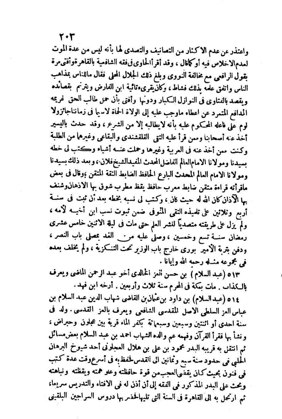 514 - عبد السَّلَام بن دَاوُد بن عُثْمَان بن القَاضِي شهَاب الدّين عبد السَّلَام بن عَبَّاس الْعِزّ السلطي الأَصْل الْمَقْدِسِي الشَّافِعِي وَيعرف بالعز الْقُدسِي /. ولد فِي سنة إِحْدَى أَو اثْنَتَيْنِ وَسبعين وَسَبْعمائة بِكفْر المَاء قَرْيَة بَين عجلون وحبراض، وَنَشَأ بهَا فَقَرَأَ الْقُرْآن وفهمه عَم وَالِده الشهَاب أَحْمد بن عبد السَّلَام بعض مسَائِل ثمَّ انْتقل بِهِ قَرِيبه الْبَدْر مَحْمُود بن عَليّ بن هِلَال العجلوني أحد شُيُوخ الْبُرْهَان الْحلَبِي فِي حُدُود سنة سبع وَثَمَانِينَ إِلَى الْقُدس فحفظ بِهِ فِي أسْرع وَقت عدَّة كتب فِي فنون بِحَيْثُ كَانَ يقْضِي الْعجب من قُوَّة حافظته وعلو همته ويقظته ونباهته وَبحث على الْبَدْر الْمَذْكُور فِي الْفِقْه إِلَى أَن أذن لَهُ فِي الافتاء والتدريس سَرِيعا، ثمَّ ارتحل بِهِ)