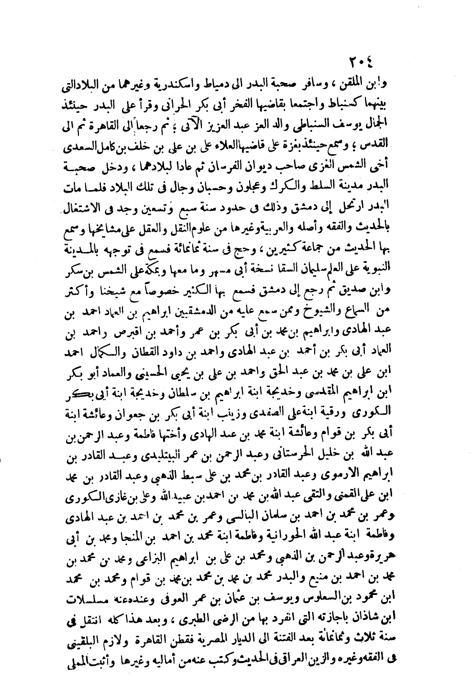 وَابْن الملقن، وسافر صُحْبَة الْبَدْر إِلَى دمياط واسكندرية وَغَيرهمَا من الْبِلَاد الَّتِي بَينهمَا كسنباط واجتمعا بقاضيها الْفَخر أبي بكر الحوراني وَقَرَأَ على الْبَدْر حِينَئِذٍ الْجمال يُوسُف السنباطي وَالِد الْعِزّ عبد الْعَزِيز الْآتِي ثمَّ رجعا إِلَى الْقَاهِرَة ثمَّ إِلَى الْقُدس وَسمع حِينَئِذٍ بغزة على قاضيها الْعَلَاء عَليّ بن عَليّ بن خلف بن كَامِل السَّعْدِيّ أخي الشَّمْس الْغَزِّي صَاحب ديوَان الفرسان ثمَّ عادا لبلادهما، وَدخل صُحْبَة الْبَدْر مَدِينَة السلط والكرك وعجلون وحسبان وجال فِي تِلْكَ الْبِلَاد فَلَمَّا مَاتَ الْبَدْر ارتحل إِلَى دمشق وَذَلِكَ فِي حُدُود سنة سبع وَتِسْعين وجد فِي الِاشْتِغَال بِالْحَدِيثِ وَالْفِقْه وَأَصله والعربية وَغَيرهَا من عُلُوم النَّقْل وَالْعقل على مشايخها وَسمع بهَا الحَدِيث من جمَاعَة كثيرين، وَحج فِي سنة ثَمَانمِائَة فَسمع فِي توجهه بِالْمَدِينَةِ النَّبَوِيَّة على الْعلم سُلَيْمَان السقا نُسْخَة أبي مسْهر وَمَا مَعهَا وبمكة على الشَّمْس بن سكر وَابْن صديق ثمَّ رَجَعَ إِلَى دمشق فَسمع بهَا الْكثير خُصُوصا مَعَ شَيخنَا وَأكْثر من السماع والشيوخ وَمِمَّنْ سمع عَلَيْهِ من الدمشقيين إِبْرَاهِيم بن الْعِمَاد أَحْمد بن عبد الْهَادِي وَإِبْرَاهِيم بن مُحَمَّد بن أبي بكر بن عمر وَأحمد بن اقبرص وَأحمد بن الْعِمَاد أبي بكر بن أَحْمد بن عبد الْهَادِي وَأحمد بن دَاوُد الْقطَّان والكمال أَحْمد ابْن عَليّ بن مُحَمَّد بن عبد الْحق وَأحمد بن عَليّ بن يحيى الْحُسَيْنِي والعماد أَبُو بكر ابْن إِبْرَاهِيم الْمَقْدِسِي وَخَدِيجَة ابْنة إِبْرَاهِيم بن سُلْطَان وَخَدِيجَة ابْنة أبي بكر الكوري ورقية ابْنة عَليّ الصَّفَدِي وَزَيْنَب ابْنة أبي بكر بن جعوان وَعَائِشَة ابْنة أبي بكر بن قوام وَعَائِشَة ابْنة مُحَمَّد بن عبد الْهَادِي وَأُخْتهَا فَاطِمَة وَعبد الرَّحْمَن بن عبد الله بن خَلِيل الحرستاني وَعبد الرَّحْمَن بن عمر البيتليدي وَعبد الْقَادِر بن إِبْرَاهِيم الأرموي وَعبد الْقَادِر بن مُحَمَّد بن عَليّ سبط الذَّهَبِيّ وَعبد الْقَادِر بن مُحَمَّد ابْن عَليّ القمني والتقي عبد الله بن مُحَمَّد بن أَحْمد بن عبيد الله وَعلي بن غَازِي الكوري وَعمر بن مُحَمَّد بن أَحْمد بن سلمَان البالسي وَعمر بن مُحَمَّد بن أَحْمد بن عبد الْهَادِي وَفَاطِمَة ابْنة عبد الله الحورانية وَفَاطِمَة ابْنة مُحَمَّد بن أَحْمد بن المنجا وَمُحَمّد بن أبي هُرَيْرَة وَعبد الرَّحْمَن بن الذَّهَبِيّ وَمُحَمّد بن عَليّ بن إِبْرَاهِيم البزاعي وَمُحَمّد بن مُحَمَّد بن مُحَمَّد بن أَحْمد بن منيع والبدر مُحَمَّد بن مُحَمَّد بن مُحَمَّد بن مُحَمَّد بن قوام وَمُحَمّد بن مُحَمَّد ابْن مَحْمُود بن السعلوسي ويوسف بن عُثْمَان بن عمر الْعَوْفِيّ وَعِنْده عَنهُ مسلسلات ابْن شَاذان باجازته الَّتِي انْفَرد بهَا مَا الرضى الطَّبَرِيّ، وَبعد هَذَا كُله انْتقل فِي سنة ثَلَاث وَثَمَانمِائَة بعد)