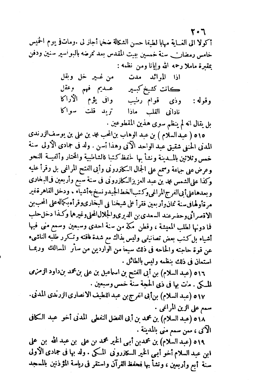 515 - عبد السَّلَام بن عبد الْوَهَّاب بن الْمُحب مُحَمَّد بن عَليّ بن يُوسُف الزرندي الْمدنِي الْحَنَفِيّ شَقِيق عبد الْوَاحِد / الْآتِي وَهَذَا أسن. ولد فِي جُمَادَى الأولى سنة خمس وَثَلَاثِينَ بِالْمَدِينَةِ وَنَشَأ بهَا فحفظ كتبا كالشاطبية وَالْمُخْتَار وألفية النَّحْو وَعرض على جمَاعَة وَسمع على الْجمال الكازروني وَأبي الْفَتْح المراغي بل وَقَرَأَ عَلَيْهِ وَكَذَا على الشَّمْس مُحَمَّد بن عبد الْعَزِيز الكازروني فِي سنة سبع وَأَرْبَعين فِي البُخَارِيّ وَبعدهَا على أبي الْفرج المراغي وَكتب الْخط الْجيد وَنسخ بِهِ أَشْيَاء، وَدخل الْقَاهِرَة غير مرّة أَولهَا فِي سنة ثَمَان وَأَرْبَعين فَقَرَأَ على شَيخنَا فِي البُخَارِيّ وقرأه بِكَمَالِهِ على الْمُحب بن الاقصرائي وَحضر عِنْد السَّعْدِيّ بن الديري والجلال الْمحلي وَغَيرهمَا وَكَذَا دخل حلب فَمَا دونهَا لطلب الْمَعيشَة، وقطن مَكَّة من سنة إِحْدَى وَسبعين وَسمع مني فِيهَا أَشْيَاء بل كتب بعض تصانيفي وَلَيْسَ بِذَاكَ مَعَ شدَّة فاقته وتكرر طلبه الناشىء عَن قُوَّة حَاجته والحاحه فِي ذَلِك سِيمَا من الواردين من سَائِر المسالك وَرُبمَا اسْتَعَانَ فِي ذَلِك بنظمه وَلَيْسَ بالطائل.