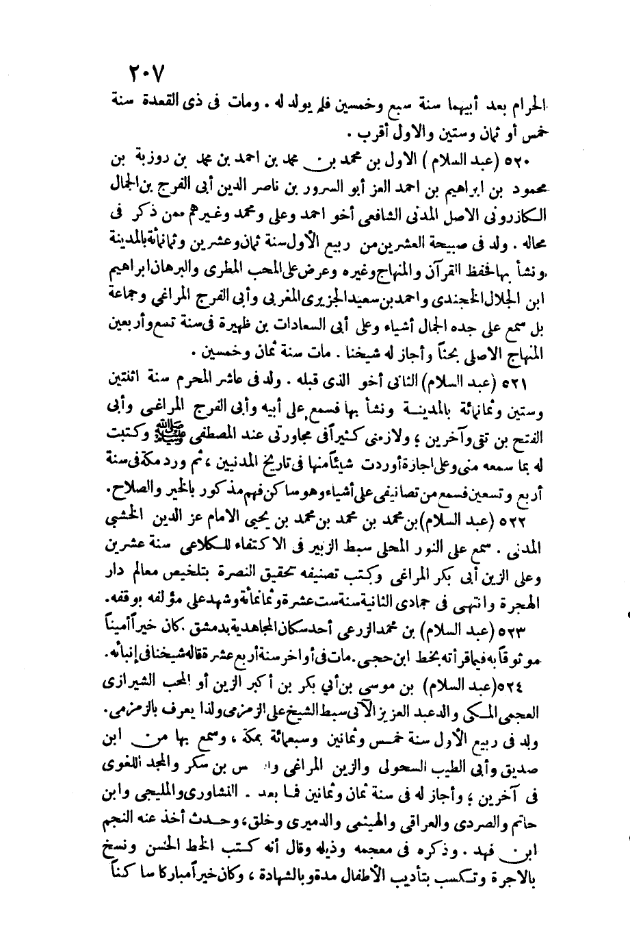 522 - عبد السَّلَام بن مُحَمَّد بن مُحَمَّد بن مُحَمَّد بن يحيى الامام عز الدّين الخشبي الْمدنِي. / سمع على النُّور الْمحلي سبط الزبير فِي الِاكْتِفَاء للكلاعي سنة عشْرين وعَلى الزين أبي بكر المراغي وَكتب تصنيفه تَحْقِيق النُّصْرَة بتلخيص معالم دَار الْهِجْرَة وانْتهى فِي جُمَادَى الثَّانِيَة سنة سِتّ عشرَة وَثَمَانمِائَة وَشهد على مُؤَلفه بوقفه.
