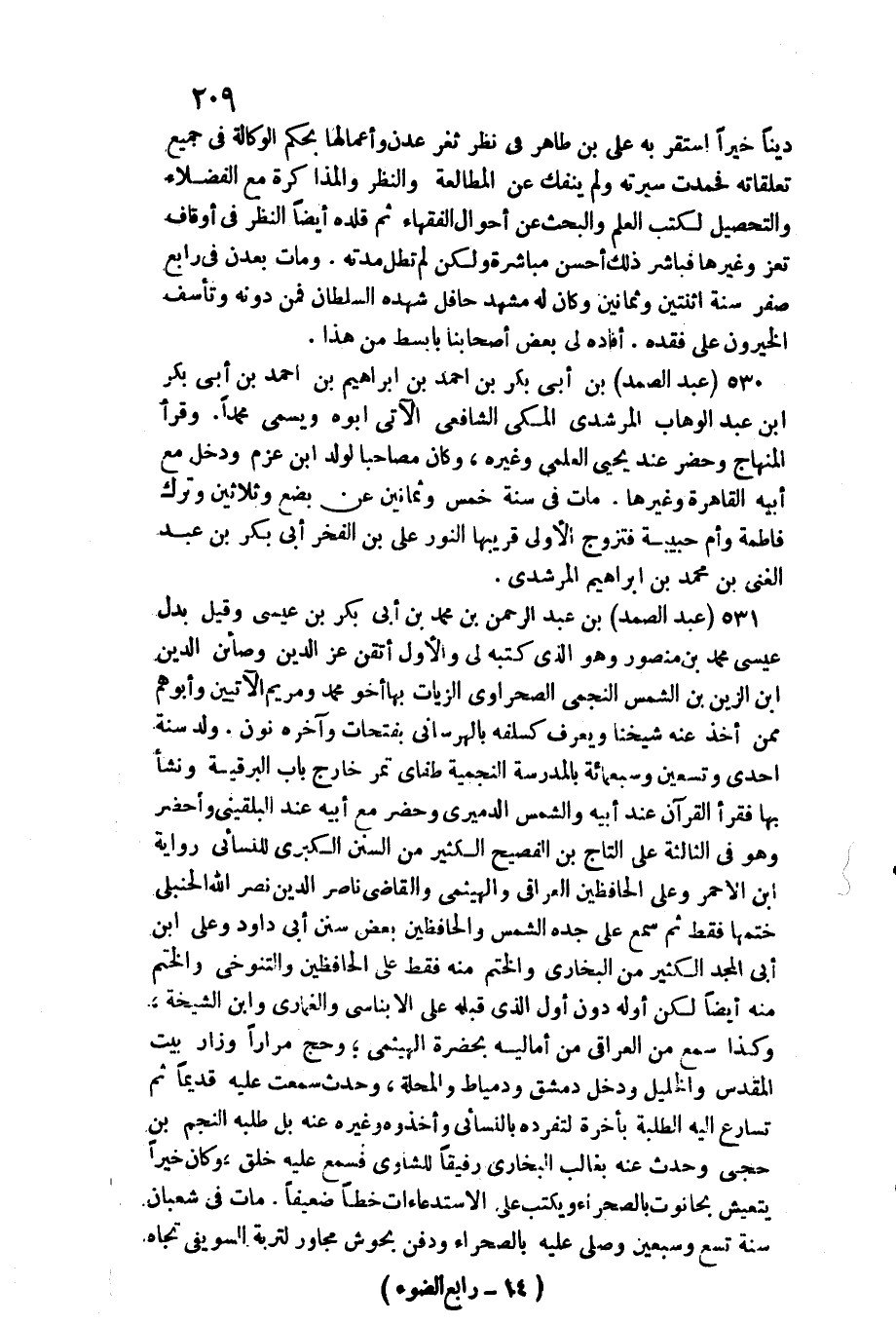 531 - عبد الصَّمد بن عبد الرَّحْمَن بن مُحَمَّد بن أبي بكر بن عِيسَى وَقيل بدل عِيسَى مُحَمَّد بن مَنْصُور / وَهُوَ الَّذِي كتبه لي وَالْأول أتقن عز الدّين وصائن الدّين ابْن الزين بن الشَّمْس النجمي الصحراوي الزيات بهَا أَخُو مُحَمَّد وَمَرْيَم الآتيين وأبوهم مِمَّن أَخذ عَنهُ شَيخنَا وَيعرف كسلفه بالهرساني بِفَتَحَات وَآخره نون. ولد سنة احدى وَتِسْعين وَسَبْعمائة بِالْمَدْرَسَةِ النجمية طفاي تمر خَارج بَاب البرقية وَنَشَأ بهَا فَقَرَأَ الْقُرْآن عِنْد أَبِيه وَالشَّمْس الدَّمِيرِيّ وَحضر مَعَ أَبِيه عِنْد البُلْقِينِيّ وأحضر وَهُوَ فِي الثَّالِثَة على التَّاج بن الفصيح الْكثير من السّنَن الْكُبْرَى للنسائي رِوَايَة ابْن الْأَحْمَر وعَلى الحافظين الْعِرَاقِيّ والهيثمي وَالْقَاضِي نَاصِر الدّين نصر الله الْحَنْبَلِيّ خَتمهَا)