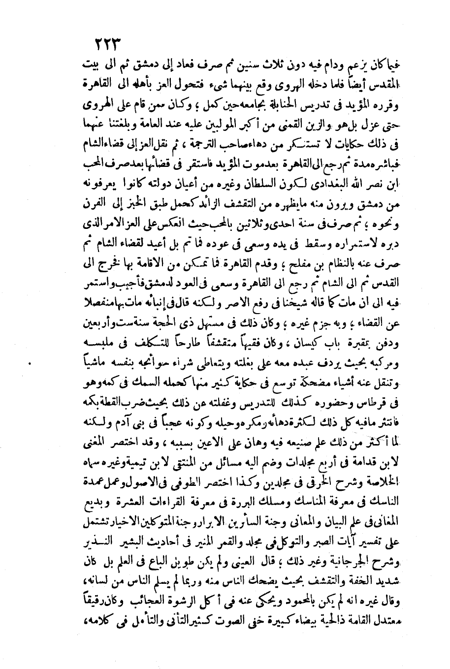 ثمَّ نقل إِلَى الْعِزّ إِلَى قَضَاء الشَّام فباشره مُدَّة ثمَّ رَجَعَ إِلَى الْقَاهِرَة بعد موت الْمُؤَيد فاستقر فِي قَضَائهَا بعد صرف الْمُحب ابْن نصر الله الْبَغْدَادِيّ لكَون السُّلْطَان وَغَيره من أَعْيَان دولته كَانُوا يعرفونه من دمشق ويرون مِنْهُ مَا يظهره من التقشف الزَّائِد كحمل طبق الْخبز إِلَى الفرن وَنَحْوه ثمَّ صرف فِي سنة إِحْدَى وَثَلَاثِينَ بالمحب حَيْثُ انعكس على الْعِزّ الْأَمر الَّذِي دبره لاستمراره وَسقط فِي يَده وسعى فِي عوده فَمَا تمّ بل أُعِيد لقَضَاء الشَّام ثمَّ صرف عَنهُ بالنظام بن مُفْلِح وَقدم الْقَاهِرَة فَمَا تمكن من الاقامة بهَا فَخرج إِلَى الْقُدس ثمَّ إِلَى الشَّام ثمَّ رَجَعَ إِلَى الْقَاهِرَة وسعى فِي الْعود لدمشق فَأُجِيب وَاسْتمرّ فِيهِ إِلَى أَن مَاتَ كَمَا قَالَه شَيخنَا فِي رفع الاصر وَلكنه قَالَ فِي إنبائه مَاتَ بهَا مُنْفَصِلا عَن الْقَضَاء وَبِه جزم غَيره وَكَانَ فَقِيها متقشفا طارحا للتكلف فِي ملبسه ومركبه بِحَيْثُ يردف عَبده مَعَه على بغلته وَيتَعَاطَى شِرَاء حَوَائِجه بِنَفسِهِ مَاشِيا وتنقل عَنهُ أَشْيَاء مضحكة توسع فِي حِكَايَة كثير مِنْهَا كحمله السّمك فِي كمه وَهُوَ فِي قرطاس وحضوره كَذَلِك للتدريس وغفلته عَن ذَلِك بِحَيْثُ ضرب القطة بكمه فانتثر مَا فِيهِ كل ذَلِك لِكَثْرَة دهائه ومكره وحيله وَكَونه عجبا فِي بني آدم وَلكنه لما أَكثر من ذَلِك علم صَنِيعه فِيهِ وَهَان على الْأَعْين بِسَبَبِهِ، وَقد اختصر الْمُغنِي لِابْنِ قدامَة فِي أَربع مجلدات وَضم إِلَيْهِ مسَائِل من المنتقي لِابْنِ تَيْمِية وَغَيره سَمَّاهُ الْخُلَاصَة وَشرح الْخرقِيّ فِي مجلدين وَكَذَا اختصر الطوفي فِي الاصول وَعمل عُمْدَة الناسك فِي معرفَة الْمَنَاسِك ومسلك البررة فِي معرفَة الْقرَاءَات الْعشْرَة وبديع المغاني فِي علم الْبَيَان والمعاني وجنة السائرين الابرار وجنة المتوكلين الأخيار تشْتَمل على تَفْسِير آيَات الصَّبْر والتوكل فِي مُجَلد وَالْقَمَر الْمُنِير فِي أَحَادِيث البشير النذير وَشرح الجرجانية وَغير ذَلِك قَالَ الْعَيْنِيّ وَلم يكن طَوِيل الباع فِي الْعلم بل كَانَ شَدِيد الخفة والتقشف بِحَيْثُ يضْحك النَّاس مِنْهُ وَرُبمَا لم يسلم النَّاس من لِسَانه، وَقَالَ غَيره إِنَّه لم يكن بالمحمود ويحكى عَنهُ فِي أكل الرِّشْوَة الْعَجَائِب وَكَانَ رَقِيقا معتدل الْقَامَة ذَا لحية بَيْضَاء كَبِيرَة خَفِي الصَّوْت كثير التأني والتأمل فِي كَلَامه،
