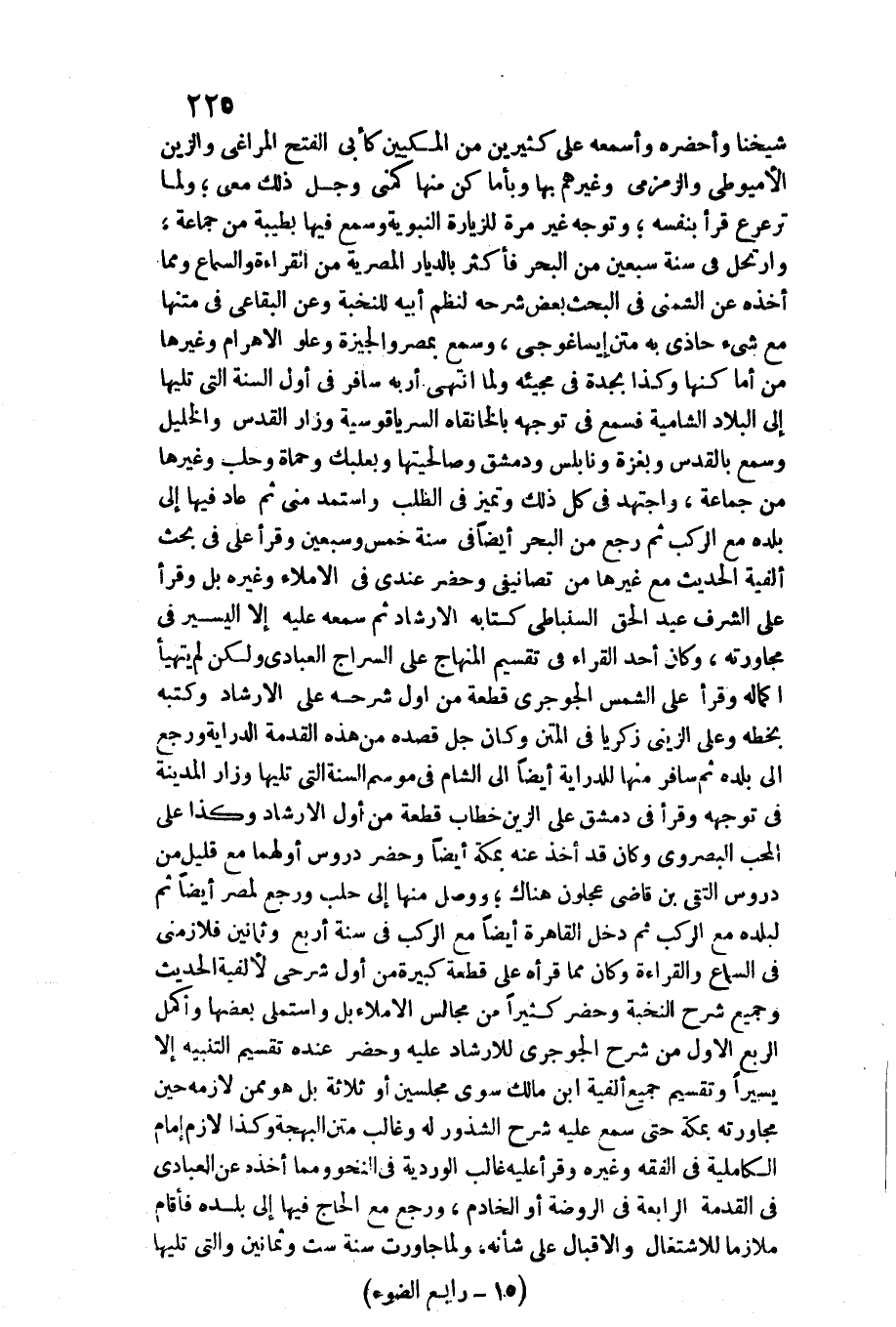 جمَاعَة، وارتحل فِي سنة سبعين من الْبَحْر فَأكْثر بالديار المصرية من الْقِرَاءَة وَالسَّمَاع وَمِمَّا أَخذه عَن الشمني فِي الْبَحْث بعض شَرحه لنظم أَبِيه للنخبة وَعَن البقاعي فِي متنها مَعَ شَيْء حَاذَى بِهِ متن إيساغوجي، وَسمع بِمصْر والجيزة وعلو الأهرام وَغَيرهَا من أماكنها وَكَذَا بجدة فِي مَجِيئه وَلما انْتهى أربه سَافر فِي أول السّنة الَّتِي تَلِيهَا إِلَى الْبِلَاد الشامية فَسمع فِي توجهه بالخانقاه السرياقوسية وزار الْقُدس والخليل وَسمع بالقدس وبغزة ونابلس ودمشق وصالحيتها وبعلبك وحماة وحلب وَغَيرهَا من جمَاعَة، واجتهد فِي كل ذَلِك وتميز فِي الطّلب واستمد مني ثمَّ عَاد فِيهَا إِلَى بَلَده مَعَ الركب ثمَّ رَجَعَ من الْبَحْر أَيْضا فِي سنة خمس وَسبعين وَقَرَأَ عَليّ فِي بحث ألفية الحَدِيث مَعَ غَيرهَا من تصانيفي وَحضر عِنْدِي فِي الاملاء وَغَيره بل وَقَرَأَ على الشّرف عبد الْحق السنباطي كِتَابه الارشاد ثمَّ سَمعه عَلَيْهِ إِلَّا الْيَسِير فِي مجاورته، وَكَانَ أحد الْقُرَّاء فِي تَقْسِيم الْمِنْهَاج على السراج الْعَبَّادِيّ وَلَكِن لم يتهيأ اكماله وَقَرَأَ على الشَّمْس الْجَوْجَرِيّ قِطْعَة من أول شَرحه على الارشاد وَكتبه بِخَطِّهِ وعَلى الزيني زَكَرِيَّا فِي الْمَتْن وَكَانَ جلّ قَصده من هَذِه القدمة الدِّرَايَة وَرجع إِلَى بَلَده ثمَّ سَافر مِنْهَا للدراية أَيْضا إِلَى الشَّام فِي موسم السّنة الَّتِي تَلِيهَا وزار الْمَدِينَة فِي توجهه وَقَرَأَ فِي دمشق على الزين خطاب قِطْعَة من أول الارشاد وَكَذَا على الْمُحب البصروي وَكَانَ قد أَخذ عَنهُ بِمَكَّة أَيْضا وَحضر دروس أَولهمَا مَعَ قَلِيل من دروس التقي بن قَاضِي عجلون هُنَاكَ وَوصل مِنْهَا إِلَى حلب وَرجع لمصر أَيْضا ثمَّ لبلده مَعَ الركب ثمَّ دخل الْقَاهِرَة أَيْضا مَعَ الركب فِي سنة أَربع وَثَمَانِينَ فلازمني فِي السماع وَالْقِرَاءَة وَكَانَ مِمَّا قَرَأَهُ على قِطْعَة كَبِيرَة من أول شرحي لألفية الحَدِيث وَجَمِيع شرح النخبة وَحضر كثيرا من مجَالِس الاملاء بل واستملى بَعْضهَا وأكمل الرّبع الأول من شرح الْجَوْجَرِيّ للارشاد عَلَيْهِ وَحضر عِنْده تَقْسِيم التَّنْبِيه إِلَّا يَسِيرا وتقسيم جَمِيع ألفية ابْن مَالك سوى مجلسين أَو ثَلَاثَة بل هُوَ مِمَّن لَازمه حِين مجاورته بِمَكَّة حَتَّى سمع عَلَيْهِ شرح الشذور لَهُ وغالب متن الْبَهْجَة وَكَذَا لَازم إِمَام الكاملية فِي الْفِقْه وَغَيره وَقَرَأَ عَلَيْهِ غَالب الوردية فِي النَّحْو وَمِمَّا أَخذه عَن الْعَبَّادِيّ فِي القدمة الرَّابِعَة فِي الرَّوْضَة أَو الْخَادِم، وَرجع مَعَ الْحَاج فِيهَا إِلَى بَلَده فَأَقَامَ ملازما للاشتغال والاقبال على شَأْنه، وَلما جَاوَرت سنة سِتّ وَثَمَانِينَ وَالَّتِي تَلِيهَا