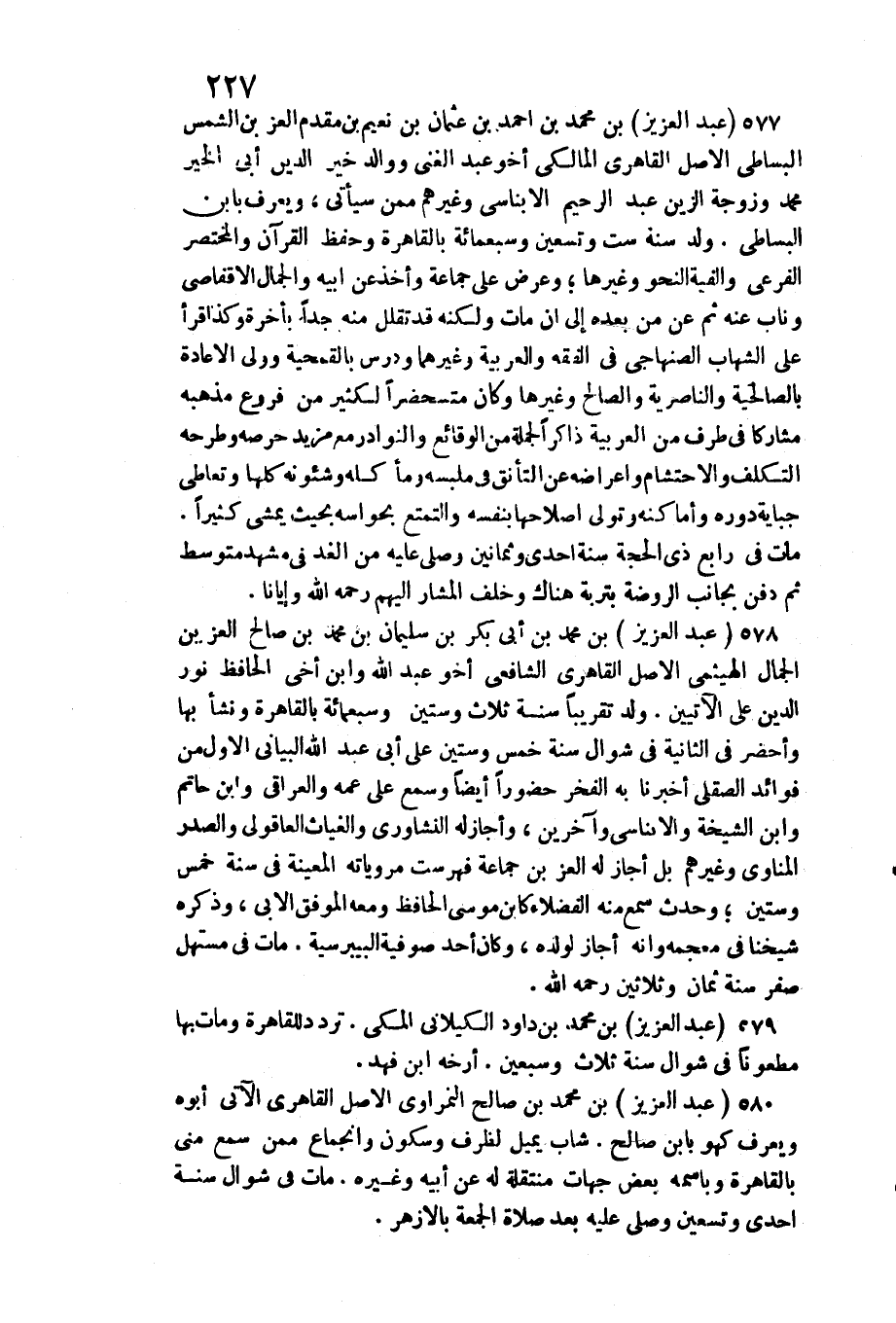 580 - عبد الْعَزِيز بن مُحَمَّد بن صَالح النمراوي الأَصْل القاهري / الْآتِي أَبوهُ وَيعرف كَهُوَ بِابْن صَالح. شَاب يمِيل لظرف وَسُكُون وانجماع مِمَّن سمع مني بِالْقَاهِرَةِ وباسمه بعض جِهَات منتقلة لَهُ عَن أَبِيه وَغَيره. مَاتَ فِي شَوَّال سنة إِحْدَى وَتِسْعين وَصلى عَلَيْهِ بعد صَلَاة الْجُمُعَة بالأزهر.)