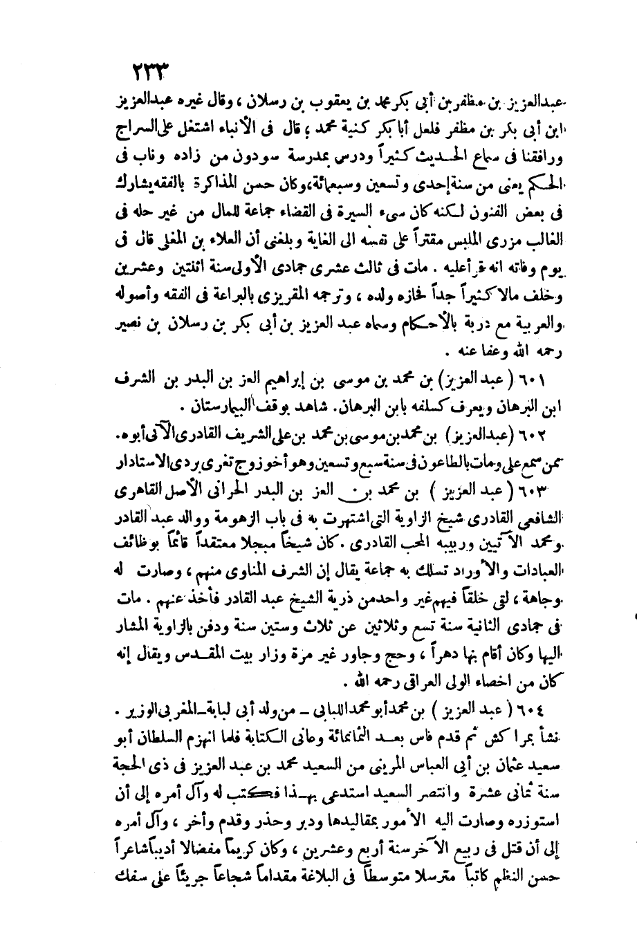 603 - عبد الْعَزِيز بن مُحَمَّد بن الْعِزّ بن الْبَدْر الْحَرَّانِي الأَصْل القاهري الشَّافِعِي القادري / شيخ الزاوية الَّتِي اشتهرت بِهِ فِي بَاب الزهومة ووالد عبد الْقَادِر وَمُحَمّد الآتيين وربيبه الْمُحب القادري، كَانَ شَيخا مبجلا مُعْتَقدًا قَائِما بوظائف الْعِبَادَات والأوراد تسلك بِهِ جمَاعَة يُقَال إِن الشّرف الْمَنَاوِيّ مِنْهُم، وَصَارَت لَهُ وجاهة، لَقِي خلقا فيهم غير وَاحِد من ذُرِّيَّة الشَّيْخ عبد الْقَادِر فَأخذ عَنْهُم. مَاتَ فِي جُمَادَى الثَّانِيَة سنة تسع وَثَلَاثِينَ عَن ثَلَاث وَسِتِّينَ سنة وَدفن بالزاوية الْمشَار اليها وَكَانَ أَقَامَ بهَا دهرا، وَحج وجاور غير مرّة وزار بَيت الْمُقَدّس وَيُقَال إِنَّه كَانَ من أخصاء الْوَلِيّ الْعِرَاقِيّ رَحمَه الله.)