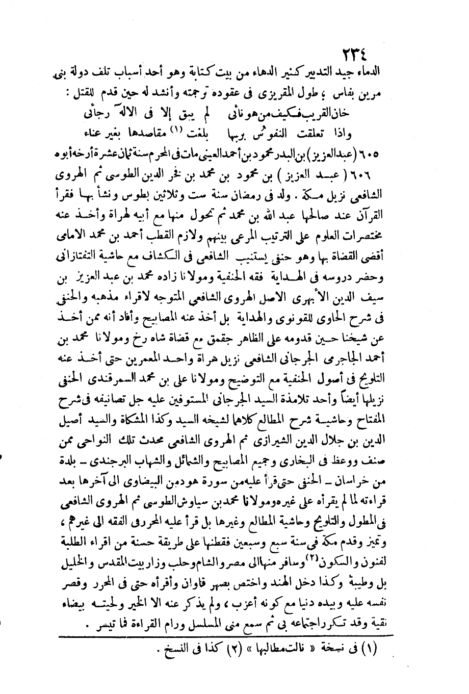 606 - عبد الْعَزِيز بن مَحْمُود بن مُحَمَّد بن فَخر الدّين الطوسي ثمَّ الْهَرَوِيّ الشَّافِعِي نزيل مَكَّة. / ولد فِي رَمَضَان سنة سِتّ وَثَلَاثِينَ بطوس وَنَشَأ بهَا فَقَرَأَ الْقُرْآن عِنْد صالحها عبد الله بن مُحَمَّد ثمَّ تحول مِنْهَا مَعَ أَبِيه لهراة وَأخذ عَنهُ مختصرات الْعُلُوم على التَّرْتِيب المرعى بَينهم ولازم القطب أَحْمد بن مُحَمَّد الامامي أقضى الْقُضَاة بهَا وَهُوَ حَنَفِيّ يَسْتَنِيب الشَّافِعِي فِي الْكَشَّاف مَعَ حَاشِيَة التَّفْتَازَانِيّ وَحضر دروسه فِي الْهِدَايَة فقه الْحَنَفِيَّة ومولانا زَاده مُحَمَّد بن عبد الْعَزِيز بن سيف الدّين الْأَبْهَرِيّ الأَصْل الْهَرَوِيّ الشَّافِعِي المتوجه لاقراء مذْهبه والحنفي فِي شرح الْحَاوِي للقونوي وَالْهِدَايَة بل أَخذ عَنهُ المصابيح وَأفَاد أَنه مِمَّن أَخذ عَن شَيخنَا حِين قدومه عَليّ الظَّاهِر جقمق مَعَ قُضَاة شاه رخ ومولانا مُحَمَّد بن أَحْمد الجاجرمي الشَّافِعِي نزيل هراة وَأحد المعمرين حَتَّى أَخذ عَنهُ التَّلْوِيح فِي أصُول الْحَنَفِيَّة مَعَ التَّوْضِيح ومولانا عَليّ بن مُحَمَّد السَّمرقَنْدِي الْحَنَفِيّ نزيلها أَيْضا وَأحد تلامذة السَّيِّد الْجِرْجَانِيّ المستوفين عَلَيْهِ جلّ تصانيفه فِي شرح الْمِفْتَاح وحاشية شرح الْمطَالع كِلَاهُمَا لشيخه السَّيِّد وَكَذَا الْمشكاة وَالسَّيِّد أصيل الدّين بن جلال الدّين الشِّيرَازِيّ ثمَّ الْهَرَوِيّ الشَّافِعِي مُحدث تِلْكَ النواحي مِمَّن صنف وَوعظ فِي البُخَارِيّ وَجَمِيع المصابيح وَالشَّمَائِل والشهاب البرجندي بَلْدَة من خُرَاسَان الْحَنَفِيّ حَتَّى قَرَأَ عَلَيْهِ من سُورَة هود من الْبَيْضَاوِيّ إِلَى آخرهَا بعد قِرَاءَته لما لم يقرأه على غَيره ومولانا مُحَمَّد بن)