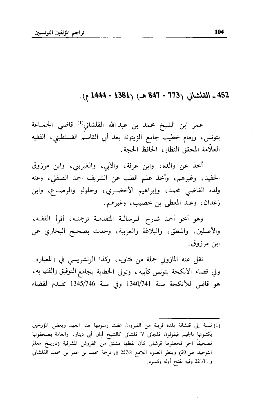 عمر ابن الشيخ محمد بن عبد الله القلشاني (¬1) قاضي الجماعة بتونس، وإمام وخطيب جامع الزيتونة بعد أبي القاسم القسنطيني، الفقيه العلاّمة المحقق النظار، الحافظ الحجة.