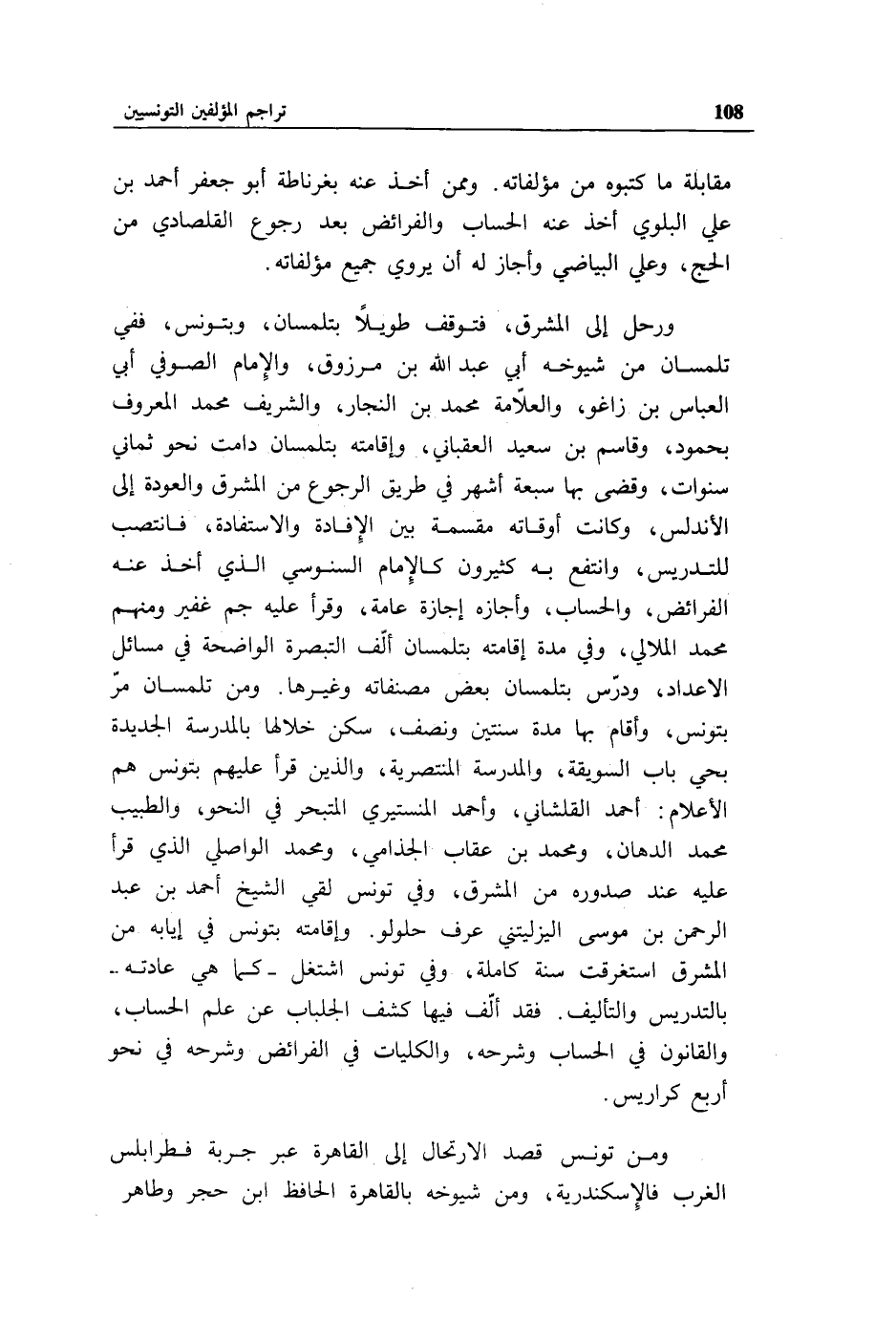 ورحل إلى المشرق، فتوقف طويلا بتلمسان، وبتونس، ففي تلمسان من شيوخه أبو عبد الله بن مرزوق، والإمام الصوفي أبو العباس بن زاغو، والعلاّمة محمد بن النجار، والشريف محمد المعروف بحمود، وقاسم بن سعيد العقباني، وإقامته بتلمسان دامت نحو ثماني سنوات، وقضى بها سبعة أشهر في طريق الرجوع من المشرق والعودة إلى الأندلس، وكانت أوقاته مقسمة بين الإفادة والاستفادة، فانتصب للتدريس، وانتفع به كثيرون كالإمام السنوسي الذي أخذ عنه الفرائض، والحساب، وأجازه إجازة عامة، وقرأ عليه جم غفير ومنهم محمد الملالي، وفي مدة إقامته بتلمسان ألّف التبصرة الواضحة في مسائل الاعداد، ودرّس بتلمسان بعض مصنفاته وغيرها. ومن تلمسان مرّ بتونس، وأقام بها مدة سنتين ونصف، سكن خلالها بالمدرسة الجديدة بحي باب السويقة، والمدرسة المنتصرية، والذين قرأ عليهم بتونس هم الأعلام: أحمد القلشاني، وأحمد المنستيري المتبحر في النحو، والطبيب محمد الدهان، ومحمد بن عقاب الجذامي، ومحمد الواصلي الذي قرأ عليه عند صدوره من المشرق، وفي تونس لقي الشيخ أحمد بن عبد الرحمن بن موسى اليزليتني عرف حلولو. وإقامته بتونس في إيابه من المشرق استغرقت سنة كاملة، وفي تونس اشتغل - كما هي عادته - بالتدريس والتأليف. فقد ألّف فيها كشف الجلباب عن علم الحساب، والقانون في الحساب وشرحه، والكليات في الفرائض وشرحه في نحو أربع كراريس.