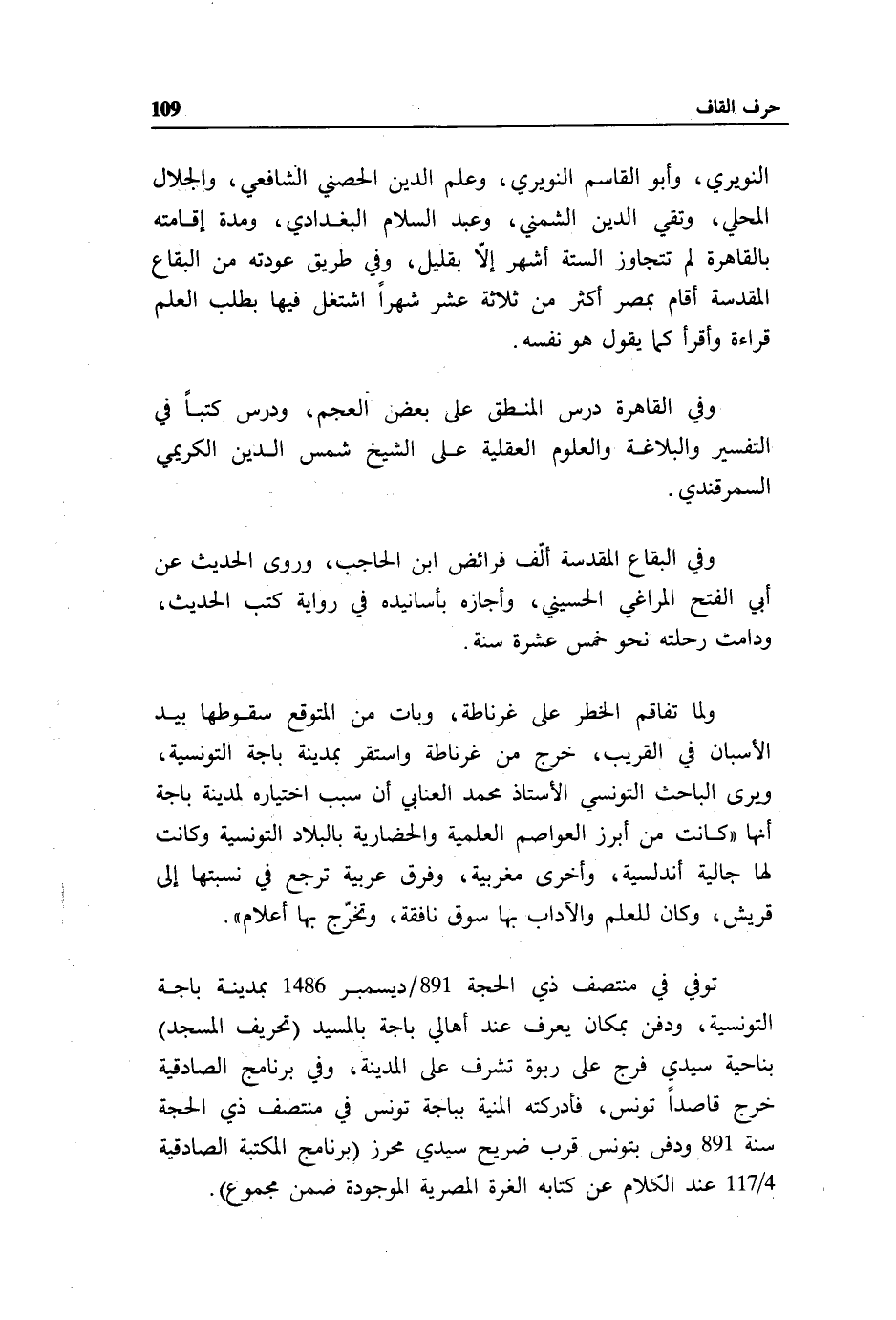 النويري، وأبو القاسم النويري، وعلم الدين الحصني الشافعي، والجلال المحلي، وتقي الدين الشمني، وعبد السلام البغدادي، ومدة إقامته بالقاهرة لم تتجاوز الستة أشهر إلاّ بقليل، وفي طريق عودته من البقاع المقدسة أقام بمصر أكثر من ثلاثة عشر شهرا اشتغل فيها بطلب العلم قراءة وأقرأ كما يقول هو نفسه.