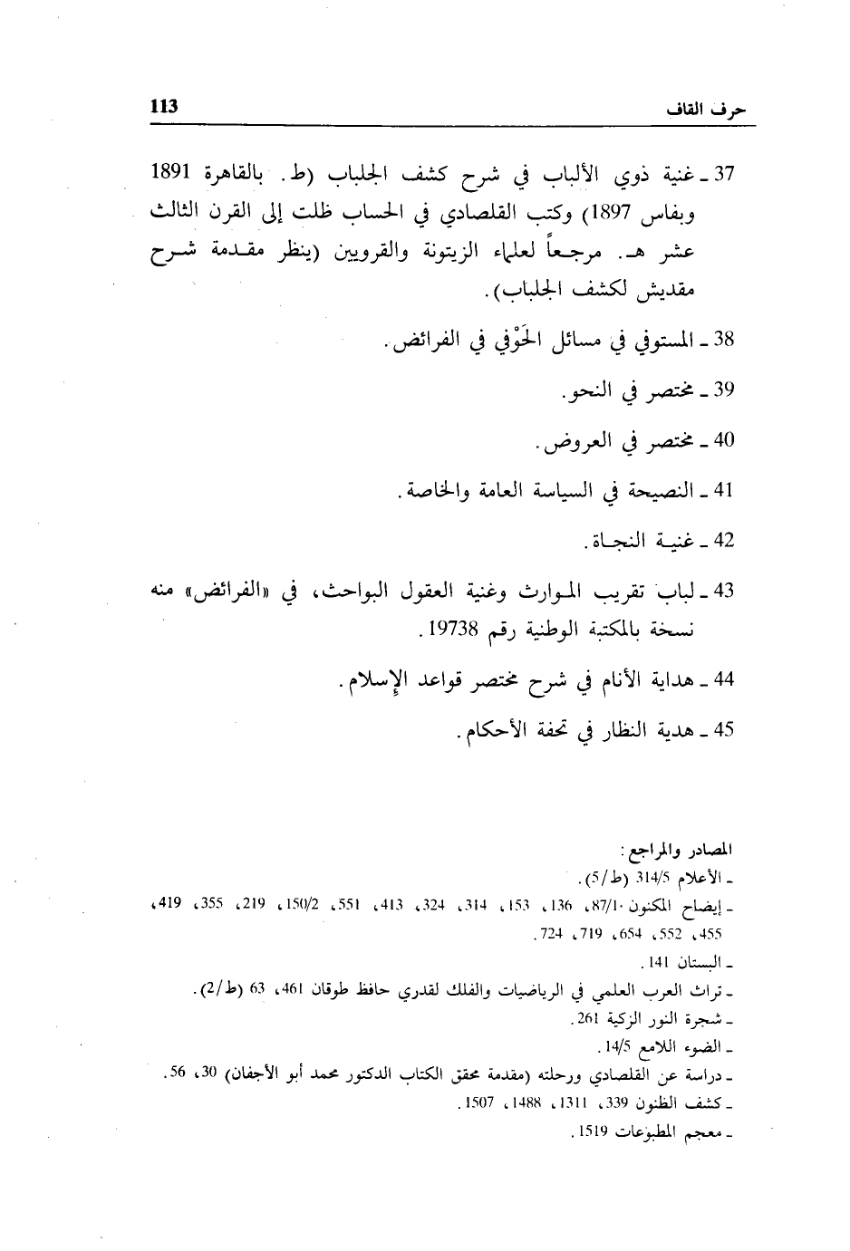 37 - غنية ذوي الألباب في شرح كشف الجلباب (ط. بالقاهرة 1891 وبفاس 1897) وكتب القلصادي في الحساب ظلت إلى القرن الثالث عشر هـ.مرجعا لعلماء الزيتونة والقرويين (ينظر مقدمة شرح مقديش لكشف الجلباب).