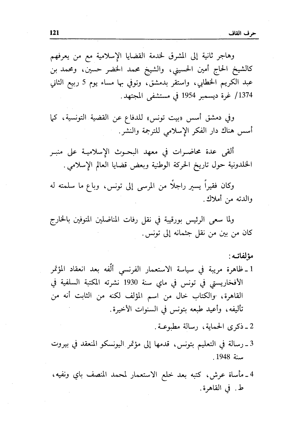 1 - ظاهرة مريبة في سياسة الاستعمار الفرنسي ألّفه بعد انعقاد المؤتمر الأفخاريستي في تونس في ماي سنة 1930 نشرته المكتبة السلفية في القاهرة، والكتاب خال من اسم المؤلف لكنه من الثابت أنه من تأليفه، وأعيد طبعه بتونس في السنوات الأخيرة.