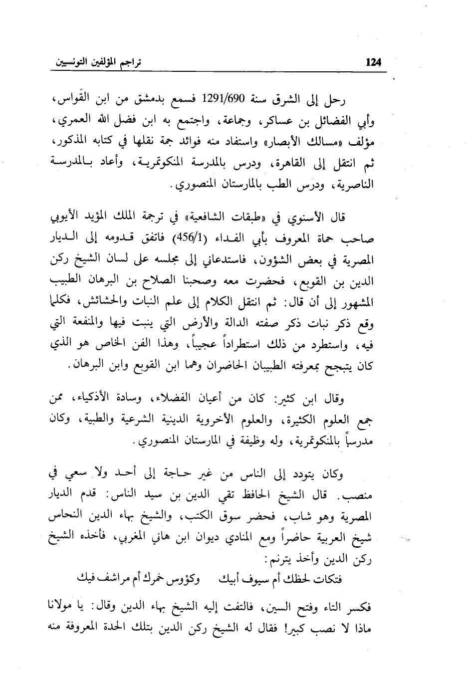 قال الأسنوي في «طبقات الشافعية» في ترجمة الملك المؤيد الأيوبي صاحب حماة المعروف بأبي الفداء (1/ 456) فاتفق قدومه إلى الديار المصرية في بعض الشئون، فاستدعاني إلى مجلسه على لسان الشيخ ركن الدين بن القوبع، فحضرت معه وصحبنا الصلاح بن البرهان الطبيب المشهور إلى أن قال: ثم انتقل الكلام إلى علم النبات والحشائش، فكلما وقع ذكر نبات ذكر صفته الدالة والأرض التي ينبت فيها والمنفعة التي فيه، واستطرد من ذلك استطرادا عجيبا، وهذا الفن الخاص هو الذي كان يتبجح بمعرفته الطبيبان الحاضران وهما ابن القوبع وابن البرهان.