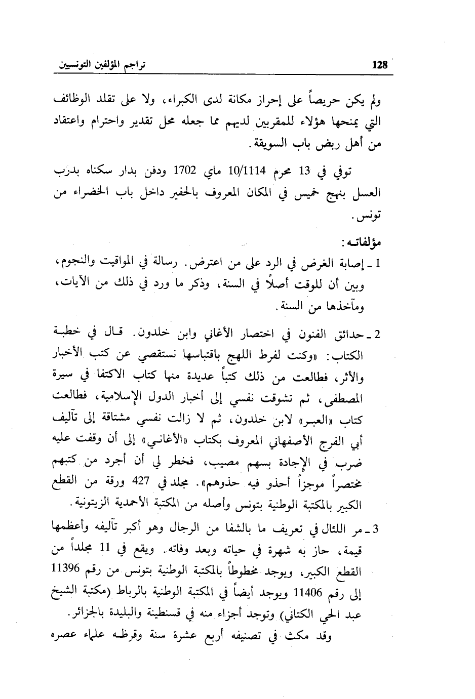 2 - حدائق الفنون في اختصار الأغاني وابن خلدون. قال في خطبة الكتاب: «وكنت لفرط اللهج باقتباسها نستقصي عن كتب الأخبار والأثر، فطالعت من ذلك كتبا عديدة منها كتاب الاكتفا في سيرة المصطفى، ثم تشوقت نفسي إلى أخبار الدول الإسلامية، فطالعت كتاب «العبر» لابن خلدون، ثم لا زالت نفسي مشتاقة إلى تآليف أبي الفرج الأصفهاني المعروف بكتاب «الأغاني» إلى أن وقفت عليه ضرب في الإجادة بسهم مصيب، فخطر لي أن أجرد من كتبهم مختصرا موجزا أحذو فيه حذوهم».مجلد في 427 ورقة من القطع الكبير بالمكتبة الوطنية بتونس وأصله من المكتبة الأحمدية الزيتونية.