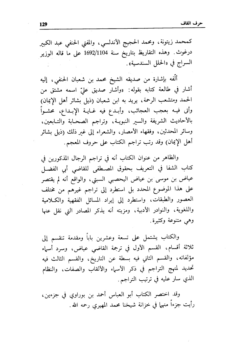 والظاهر من عنوان الكتاب أنه في تراجم الرجال المذكورين في كتاب الشفا في التعريف بحقوق المصطفى للقاضي أبي الفضل عياض بن موسى بن عياض اليحصبي السبتي، والواقع أنه لم يقتصر على هذا الموضوع المحدد بل استطرد إلى تراجم غيرهم من مختلف العصور والطبقات، واستطرد إلى إيراد المسائل الفقهية والكلامية واللغوية، والنوادر الأدبية، ومزيته أنه يذكر المصادر التي نقل عنها وهي متنوعة وكثيرة.