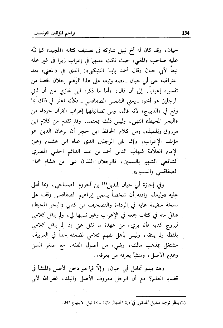 وفي إجازة أبي حيان لمنديل (¬1) بن آجروم الصنهاجي، ومما أملى عليه «وليعلم واقفه أن شخصا يسمى إبراهيم الصفاقسي وقف على نسخة سقيمة غاية في الرداءة والتصحيف من كتابي «البحر المحيط» فنقل منه في كتاب جمعه في الإعراب وغير نسبها لي، ولم ينقل كلامي ليروج كتابه فأنا بريء من عهدة ما نقل عني إذ لم ينقل كلامي بلفظه ولم ينتقه، وليس بأهل لفهم كلامي لضعفه جدا في العربية، مشتغل بمذهب مالك، وشيء من أصول الفقه، مع صغر السن وعدم الأصل، ومنشأ يعرفه من يعرفه».