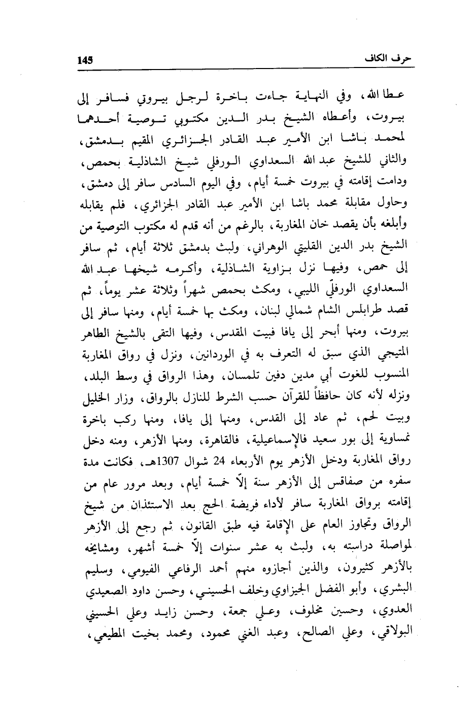 عطاء الله، وفي النهاية جاءت باخرة لرجل بيروتي فسافر إلى بيروت، وأعطاه الشيخ بدر الدين مكتوبي توصية أحدهما لمحمد باشا ابن الأمير عبد القادر الجزائري المقيم بدمشق، والثاني للشيخ عبد الله السعداوي الورفلي شيخ الشاذلية بحمص، ودامت إقامته في بيروت خمسة أيام، وفي اليوم السادس سافر إلى دمشق، وحاول مقابلة محمد باشا ابن الأمير عبد القادر الجزائري، فلم يقابله وأبلغه بأن يقصد خان المغاربة، بالرغم من أنه قدم له مكتوب التوصية من الشيخ بدر الدين الفليتي الوهراني، ولبث بدمشق ثلاثة أيام، ثم سافر إلى حمص، وفيها نزل بزاوية الشاذلية، وأكرمه شيخها عبد الله السعداوي الورفلّي الليبي، ومكث بحمص شهرا وثلاثة عشر يوما، ثم قصد طرابلس الشام شمالي لبنان، ومكث بها خمسة أيام، ومنها سافر إلى بيروت، ومنها أبحر إلى يافا فبيت المقدس، وفيها التقى بالشيخ الطاهر المتيجي الذي سبق له التعرف به في الوردانين، ونزل في رواق المغاربة المنسوب للغوت أبي مدين دفين تلمسان، وهذا الرواق في وسط البلد، ونزله لأنه كان حافظا للقرآن حسب الشرط للنازل بالرواق، وزار الخليل وبيت لحم، ثم عاد إلى القدس، ومنها إلى يافا، ومنها ركب باخرة نمساوية إلى بور سعيد فالإسماعيلية، فالقاهرة، ومنها الأزهر، ومنه دخل رواق المغاربة ودخل الأزهر يوم الأربعاء 24 شوال 1307 هـ، فكانت مدة سفره من صفاقس إلى الأزهر سنة إلاّ خمسة أيام، وبعد مرور عام من إقامته برواق المغاربة سافر لأداء فريضة الحج بعد الاستئذان من شيخ الرواق وتجاوز العام على الإقامة فيه طبق القانون، ثم رجع إلى الأزهر لمواصلة دراسته به، ولبث به عشر سنوات إلاّ خمسة أشهر، ومشايخه بالأزهر كثيرون، والذين أجازوه منهم أحمد الرفاعي الفيومي، وسليم البشري، وأبو الفضل الجيزاوي وخلف الحسيني، وحسن داود الصعيدي العدوي، وحسين مخلوف، وعلي جمعة، وحسن زايد وعلي الحسيني البولاقي، وعلي الصالح، وعبد الغني محمود، ومحمد بخيت المطيعي،