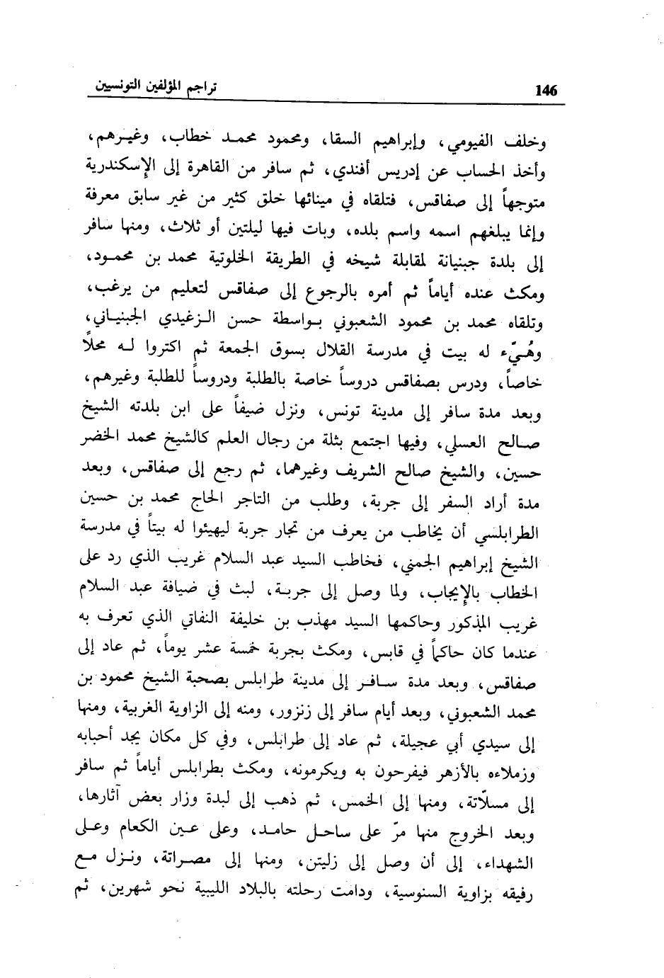 وخلف الفيومي، وإبراهيم السقا، ومحمود محمد خطاب، وغيرهم، وأخذ الحساب عن إدريس أفندي، ثم سافر من القاهرة إلى الإسكندرية متوجها إلى صفاقس، فتلقاه في مينائها خلق كثير من غير سابق معرفة وإنما يبلغهم اسمه واسم بلده، وبات فيها ليلتين أو ثلاث، ومنها سافر إلى بلدة جبنيانة لمقابلة شيخه في الطريقة الخلوتية محمد بن محمود، ومكث عنده أياما ثم أمره بالرجوع إلى صفاقس لتعليم من يرغب، وتلقاه محمد بن محمود الشعبوني بواسطة حسن الزغيدي الجبنياني، وهيّئ له بيت في مدرسة القلال بسوق الجمعة ثم اكتروا له محلا خاصا، ودرس بصفاقس دروسا خاصة بالطلبة ودروسا للطلبة وغيرهم، وبعد مدة سافر إلى مدينة تونس، ونزل ضيفا على ابن بلدته الشيخ صالح العسلي، وفيها اجتمع بثلة من رجال العلم كالشيخ محمد الخضر حسين، والشيخ صالح الشريف وغيرهما، ثم رجع إلى صفاقس، وبعد مدة أراد السفر إلى جربة، وطلب من التاجر الحاج محمد بن حسين الطرابلسي أن يخاطب من يعرف من تجار جربة ليهيئوا له بيتا في مدرسة الشيخ إبراهيم الجمني، فخاطب السيد عبد السلام غريب الذي رد على الخطاب بالإيجاب، ولما وصل إلى جربة، لبث في ضيافة عبد السلام غريب المذكور وحاكمها السيد مهذب بن خليفة النفاتي الذي تعرف به عند ما كان حاكما في قابس، ومكث بجربة خمسة عشر يوما، ثم عاد إلى صفاقس، وبعد مدة سافر إلى مدينة طرابلس بصحبة الشيخ محمود بن محمد الشعبوني، وبعد أيام سافر إلى زنزور، ومنه إلى الزاوية الغربية، ومنها إلى سيدي أبي عجيلة، ثم عاد إلى طرابلس، وفي كل مكان يجد أحبابه وزملاءه بالأزهر فيفرحون به ويكرمونه، ومكث بطرابلس أياما ثم سافر إلى مسلاّتة، ومنها إلى الخمس، ثم ذهب إلى لبدة وزار بعض آثارها، وبعد الخروج منها مرّ على ساحل حامد، وعلى عين الكعام وعلى الشهداء، إلى أن وصل إلى زليتن، ومنها إلى مصراتة، ونزل مع رفيقه بزاوية السنوسية، ودامت رحلته بالبلاد الليبية نحو شهرين، ثم