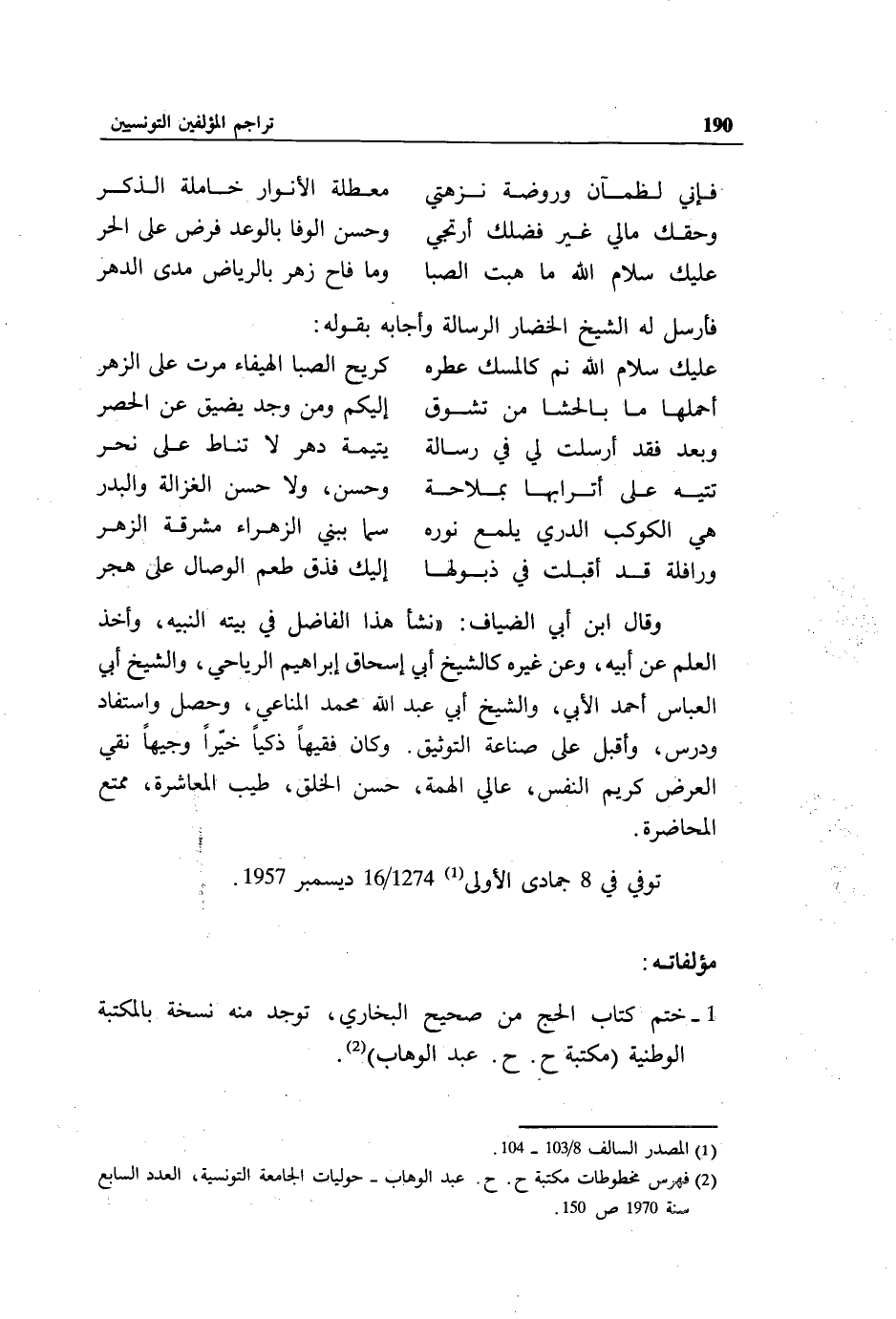 (¬2) فهرس مخطوطات مكتبة ح. ح. عبد الوهاب - حوليات الجامعة التونسية، العدد السابع سنة 1970 ص 150.