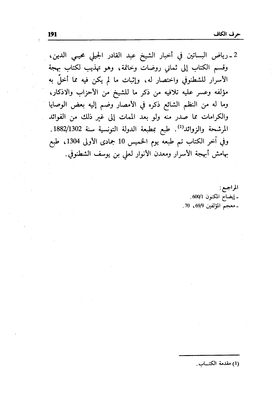 2 - رياض البساتين في أخبار الشيخ عبد القادر الجيلي محيي الدين، وقسم الكتاب إلى ثماني روضات وخاتمة، وهو تهذيب لكتاب بهجة الأسرار للشطنوفي واختصار له، وإثبات ما لم يكن فيه مما أخلّ به مؤلفه وعسر عليه تلافيه من ذكر ما للشيخ من الأحزاب والاذكار، وما له من النظم الشائع ذكره في الأمصار وضم إليه بعض الوصايا والكرامات مما صدر منه ولو بعد الممات إلى غير ذلك من الفوائد المرشحة والزوائد (¬1). طبع بمطبعة الدولة التونسية سنة 1302/ 1882.