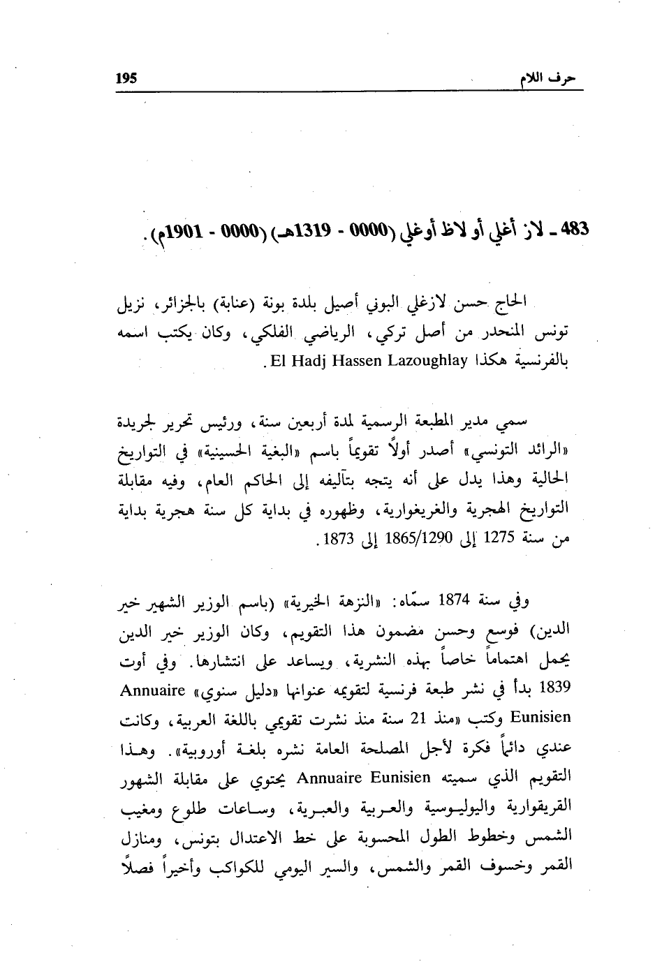 الحاج حسن لازغلي البوني أصيل بلدة بونة (عنابة) بالجزائر، نزيل تونس المنحدر من أصل تركي، الرياضي الفلكي، وكان يكتب اسمه بالفرنسية هكذا El Hadj Hassen Lazoughlay .