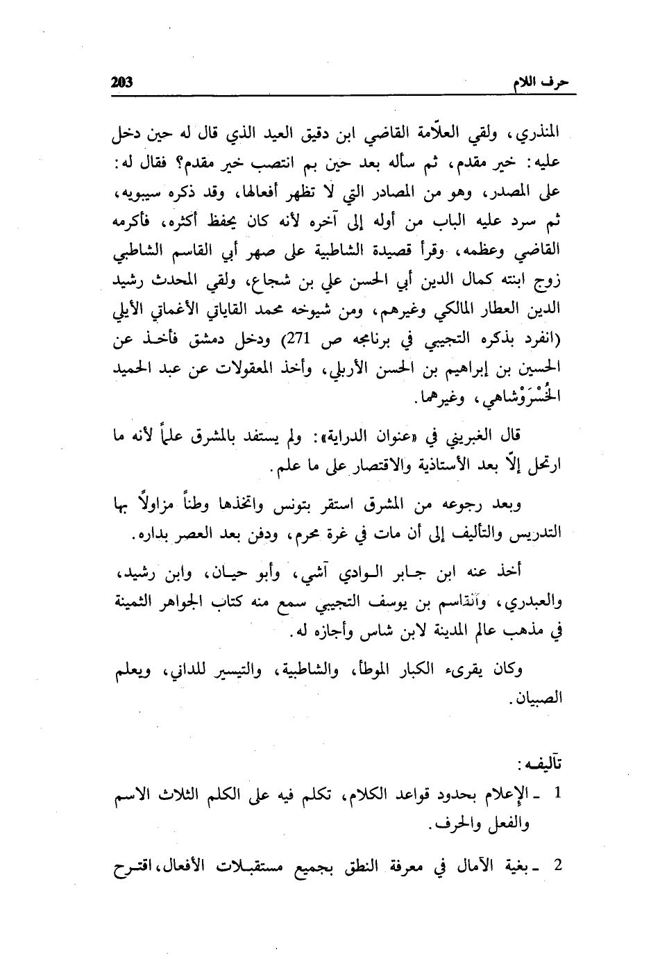 على المصدر، وهو من المصادر التي لا تظهر أفعالها، وقد ذكره سيبويه، ثم سرد عليه الباب من أوله إلى آخره لأنه كان يحفظ أكثره، فأكرمه القاضي وعظمه، وقرأ قصيدة الشاطبية على صهر أبي القاسم الشاطبي زوج ابنته كمال الدين أبي الحسن علي بن شجاع، ولقي المحدث رشيد الدين العطار المالكي وغيرهم، ومن شيوخه محمد القاياتي الأغماتي الأيلي (انفرد بذكره التجيبي في برنامجه ص 271) ودخل دمشق فأخذ عن الحسين بن إبراهيم بن الحسن الأربلي، وأخذ المعقولات عن عبد الحميد الخسروشاهيّ، وغيرهما.