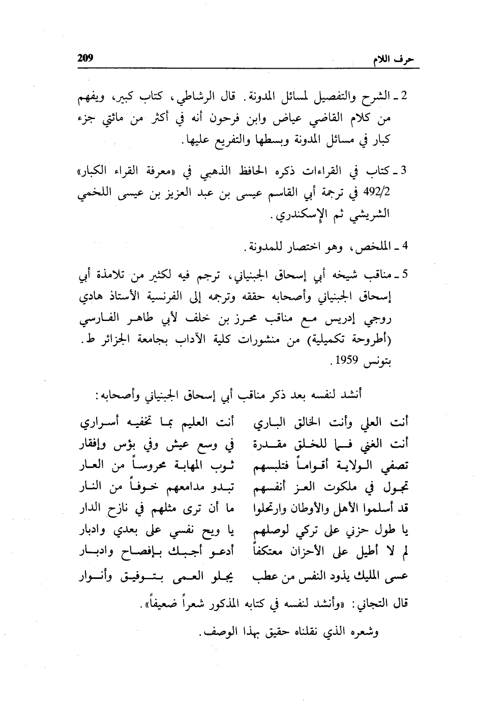 5 - مناقب شيخه أبي إسحاق الجبنياني، ترجم فيه لكثير من تلامذة أبي إسحاق الجبنياني وأصحابه حققه وترجمه إلى الفرنسية الأستاذ هادي روجي إدريس مع مناقب محرز بن خلف لأبي طاهر الفارسي (أطروحة تكميلية) من منشورات كلية الآداب بجامعة الجزائر ط.