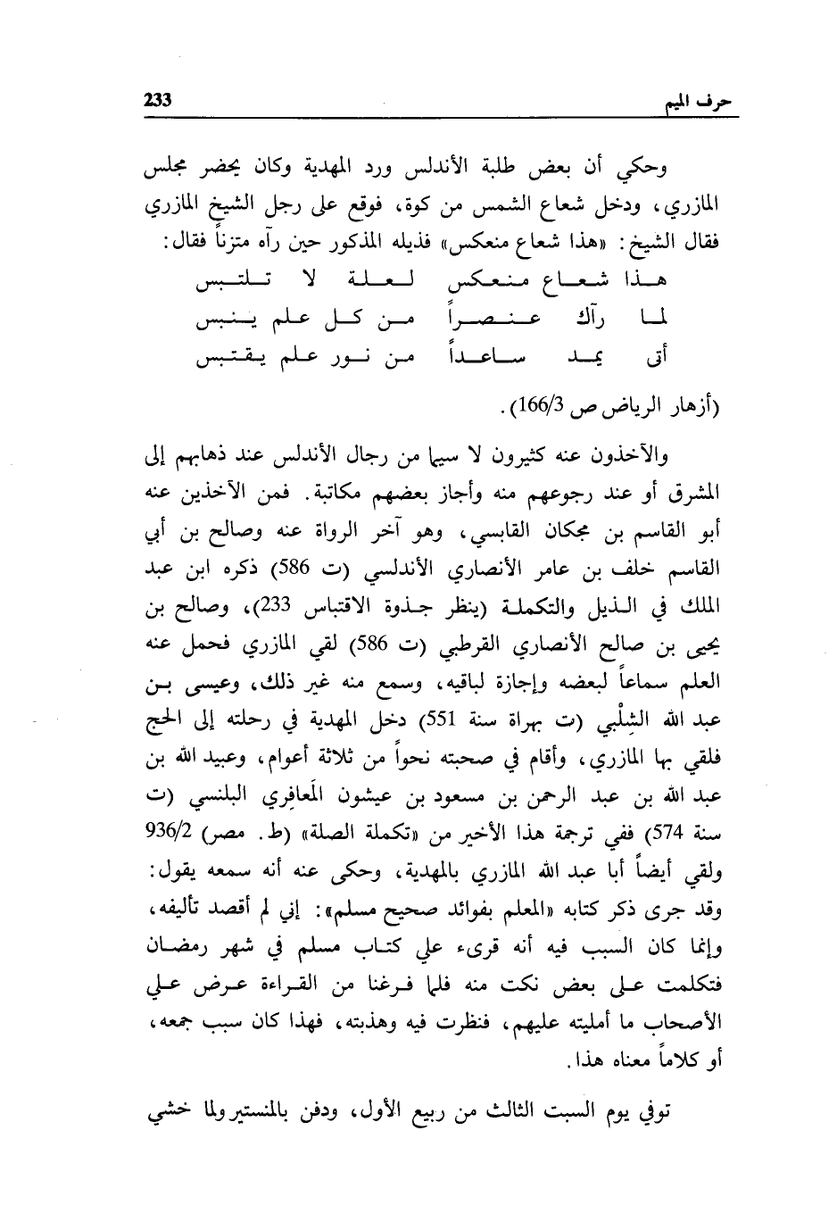 وحكي أن بعض طلبة الأندلس ورد المهدية وكان يحضر مجلس المازري، ودخل شعاع الشمس من كوة، فوقع على رجل الشيخ المازري فقال الشيخ: «هذا شعاع منعكس» فذيله المذكور حين رآه متزنا فقال: