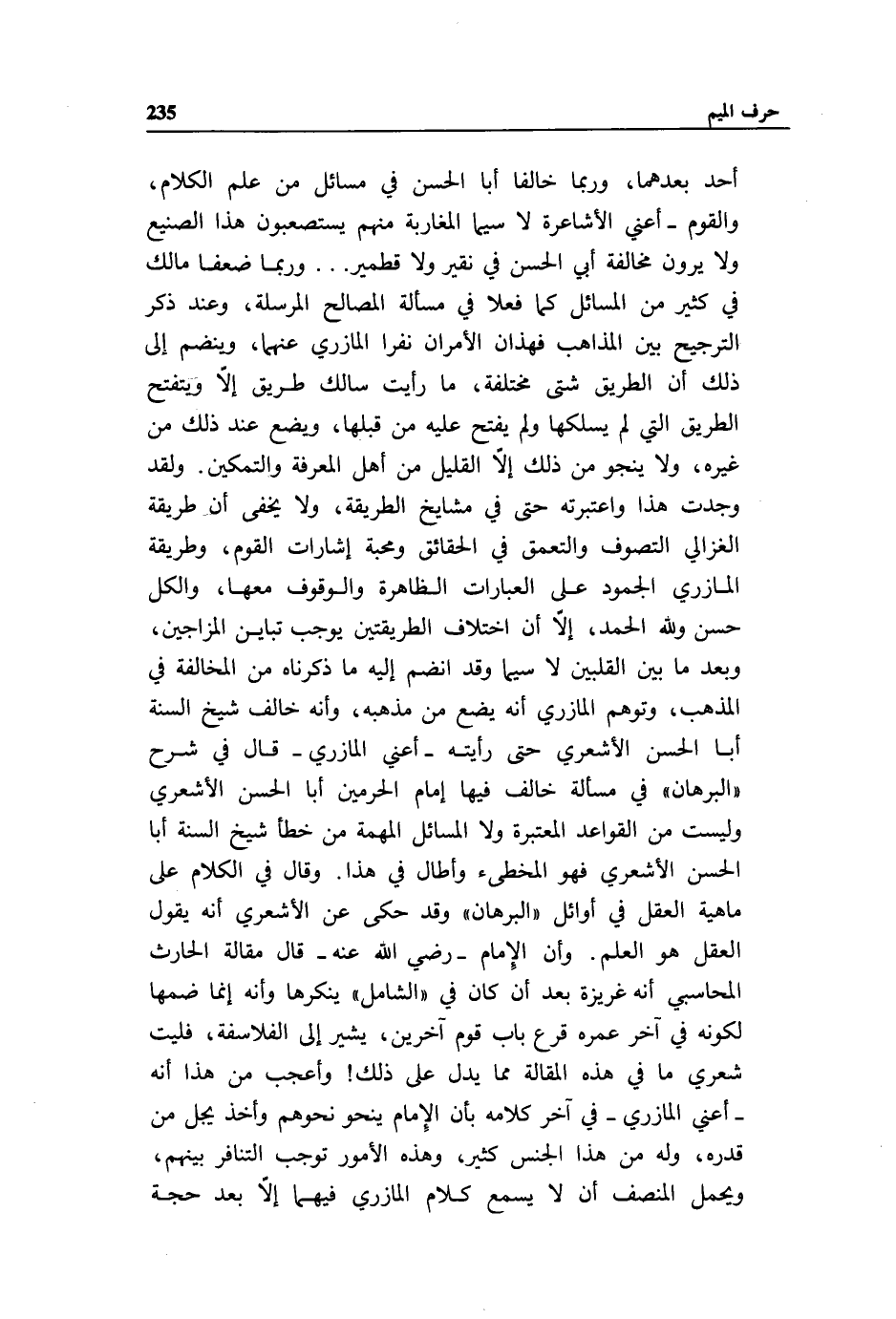 أحد بعدهما، وربما خالفا أبا الحسن في مسائل من علم الكلام، والقوم - أعني الأشاعرة لا سيما المغاربة منهم يستصعبون هذا الصنيع ولا يرون مخالفة أبي الحسن في نقير ولا قطمير ... وربما ضعفا مالك في كثير من المسائل كما فعلا في مسألة المصالح المرسلة، وعند ذكر الترجيح بين المذاهب فهذان الأمران نفرا المازري عنهما، وينضم إلى ذلك أن الطرق شتى مختلفة، ما رأيت سالك طريق إلاّ ويستقبح الطريق التي لم يسلكها ولم يفتح عليه من قبلها، ويضع عند ذلك من غيره، ولا ينجو من ذلك إلاّ القليل من أهل المعرفة والتمكين. ولقد وجدت هذا واعتبرته حتى في مشايخ الطريقة، ولا يخفى أن طريقة الغزالي التصوف والتعمق في الحقائق ومحبة إشارات القوم، وطريقة المازري الجمود على العبارات الظاهرة والوقوف معها، والكل حسن ولله الحمد، إلاّ أن اختلاف الطريقتين يوجب تباين المزاجين، وبعد ما بين القلبين لا سيما وقد انضم إليه ما ذكرناه من المخالفة في المذهب، وتوهم المازري أنه يضع من مذهبه، وأنه خالف شيخ السنة أبا الحسن الأشعري حتى رأيته - أعني المازري - قال في شرح «البرهان» في مسألة خالف فيها إمام الحرمين أبا الحسن الأشعري وليست من القواعد المعتبرة ولا المسائل المهمة من خطأ شيخ السنة أبا الحسن الأشعري فهو المخطئ وأطال في هذا. وقال في الكلام على ماهية العقل في أوائل «البرهان» وقد حكى عن الأشعري أنه يقول العقل هو العلم. وأن الإمام - رضي الله عنه - قال مقالة الحارث المحاسبي أنه غريزة بعد أن كان في «الشامل» ينكرها وأنه إنما ضمها لكونه في آخر عمره قرع باب قوم آخرين، يشير إلى الفلاسفة، فليت شعري ما في هذه المقالة مما يدل على ذلك! وأعجب من هذا أنه - أعني المازري - في آخر كلامه بأن الإمام ينحو نحوهم وأخذ يجل من قدره، وله من هذا الجنس كثير، وهذه الأمور توجب التنافر بينهم، ويجمل المنصف أن لا يسمع كلام المازري فيهما إلاّ بعد حجة