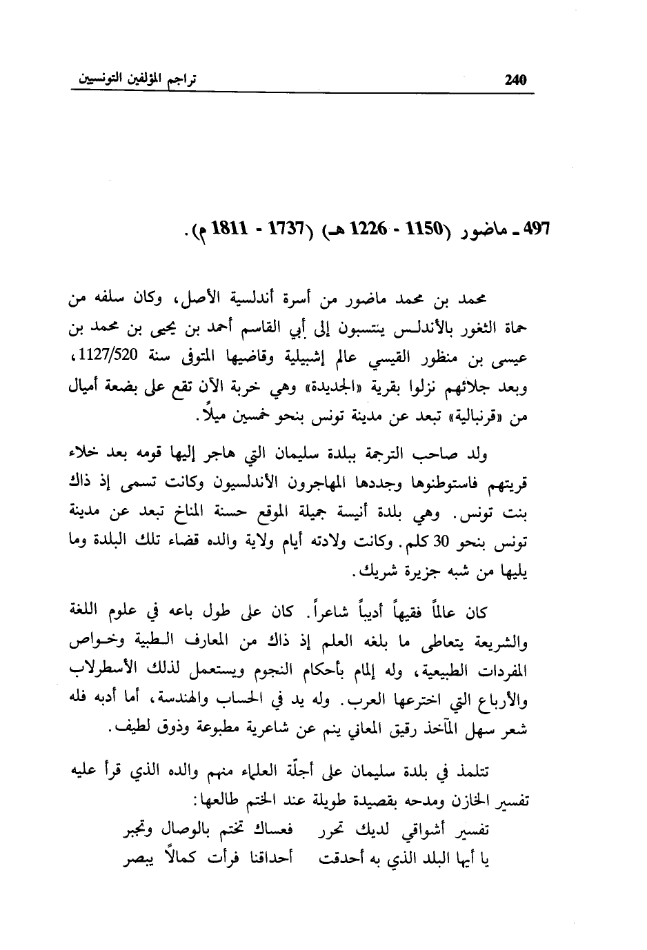 497 - ماضور (1150 - 1226 هـ) (1737 - 1811 م).