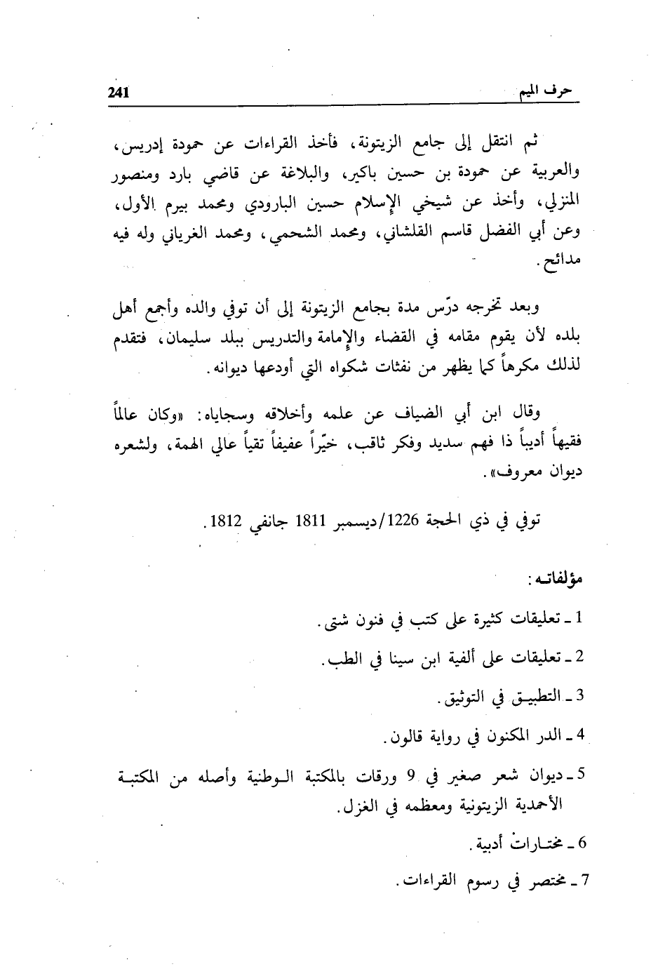 توفي في ذي الحجة /1226 ديسمبر 1811 جانفي 1812.