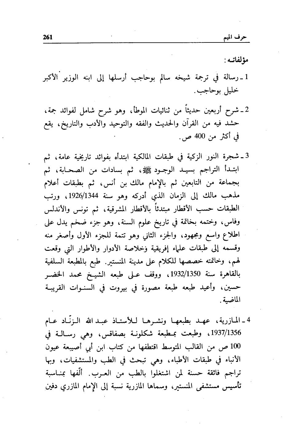 3 - شجرة النور الزكية في طبقات المالكية ابتدأه بفوائد تاريخية عامة، ثم ابتدأ التراجم بسيد الوجود صلّى الله عليه وسلم، ثم بسادات من الصحابة، ثم بجماعة من التابعين ثم بالإمام مالك بن أنس، ثم بطبقات أعلام مذهب مالك إلى الزمان الذي أدركه وهو سنة 1344/ 1926، ورتب الطبقات حسب الأقطار مبتدئا بالأقطار المشرقية، ثم تونس والأندلس وفاس، وختمه بخاتمة في تاريخ علوم السنة، وهو جزء ضخم يدل على اطلاع واسع ومجهود، والجزء الثاني وهو تتمة للجزء الأول وأصغر منه وقسمه إلى طبقات علماء إفريقية وخلاصة الأدوار والأطوار التي وقعت لهم، وخاتمته خصصها للكلام على مدينة المنستير. طبع بالمطبعة السلفية بالقاهرة سنة 1350/ 1932، ووقف على طبعه الشيخ محمد الخضر حسين، وأعيد طبعه طبعة مصورة في بيروت في السنوات القريبة الماضية.
