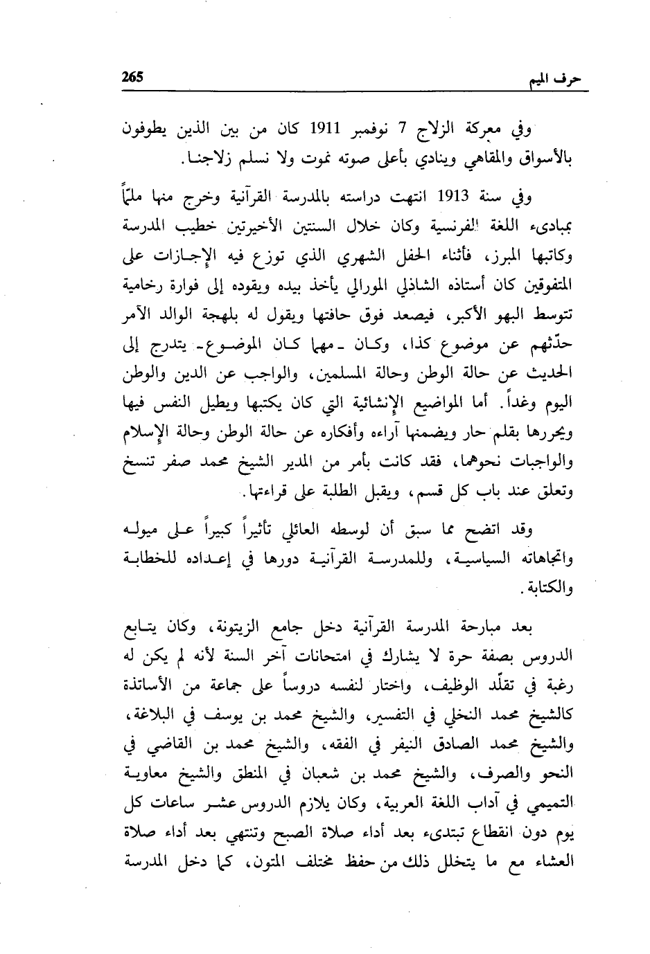 وفي سنة 1913 انتهت دراسته بالمدرسة القرآنية وخرج منها ملمّا بمبادئ اللغة الفرنسية وكان خلال السنتين الأخيرتين خطيب المدرسة وكاتبها المبرز، فأثناء الحفل الشهري الذي توزع فيه الإجازات على المتفوقين كان أستاذه الشاذلي المورالي يأخذ بيده ويقوده إلى فوارة رخامية تتوسط البهو الأكبر، فيصعد فوق حافتها ويقول له بلهجة الوالد الآمر حدّثهم عن موضوع كذا، وكان - مهما كان الموضوع - يتدرج إلى الحديث عن حالة الوطن وحالة المسلمين، والواجب عن الدين والوطن اليوم وغدا. أما المواضيع الإنشائية التي كان يكتبها ويطيل النفس فيها ويحررها بقلم حار ويضمنها آراءه وأفكاره عن حالة الوطن وحالة الإسلام والواجبات نحوهما، فقد كانت بأمر من المدير الشيخ محمد صفر تنسخ وتعلق عند باب كل قسم، ويقبل الطلبة على قراءتها.
