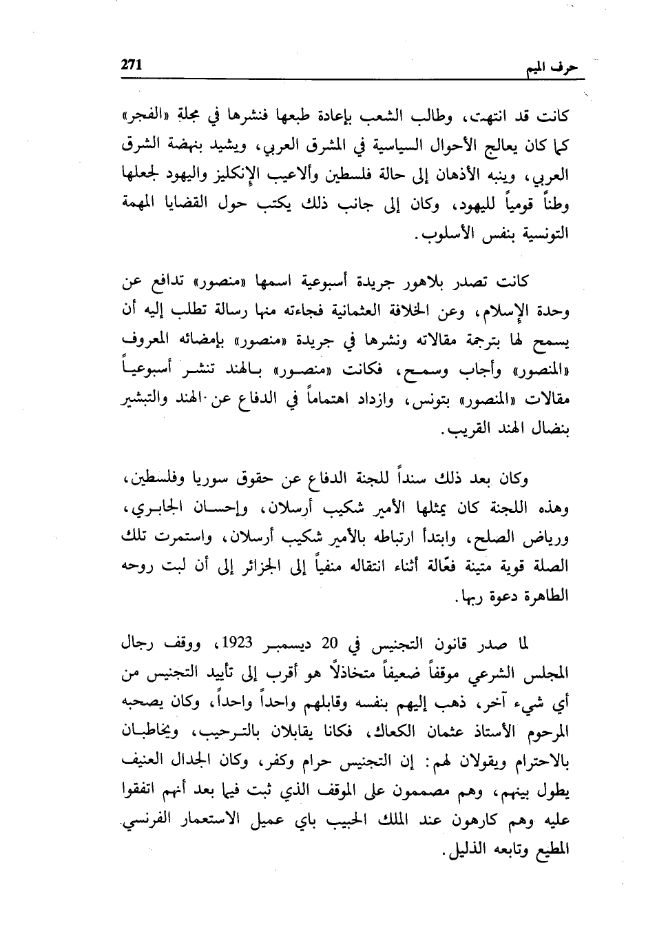 كانت قد انتهت، وطالب الشعب بإعادة طبعها فنشرها في مجلة «الفجر» كما كان يعالج الأحوال السياسية في المشرق العربي، ويشيد بنهضة الشرق العربي، وينبه الأذهان إلى حالة فلسطين وألاعيب الإنكليز واليهود لجعلها وطنا قوميا لليهود، وكان إلى جانب ذلك يكتب حول القضايا المهمة التونسية بنفس الأسلوب.