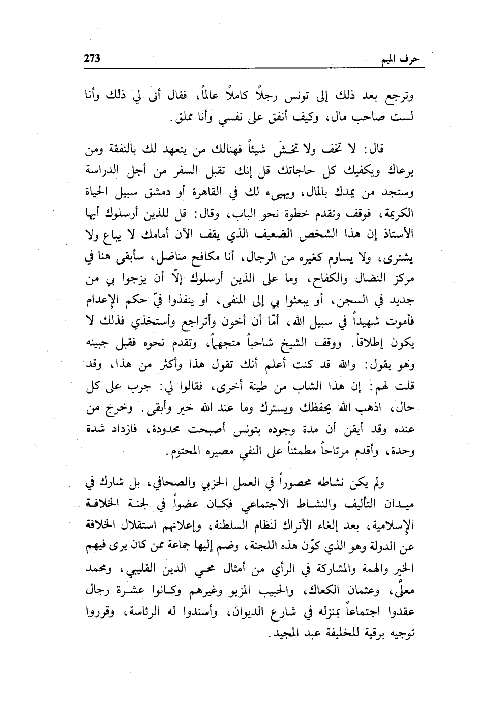 قال: لا تخف ولا تخش شيئا فهنا لك من يتعهد لك بالنفقة ومن يرعاك ويكفيك كل حاجاتك قل إنك تقبل السفر من أجل الدراسة وستجد من يمدك بالمال، ويهيئ لك في القاهرة أو دمشق سبيل الحياة الكريمة، فوقف وتقدم خطوة نحو الباب، وقال: قل للذين أرسلوك أيها الأستاذ إن هذا الشخص الضعيف الذي يقف الآن أمامك لا يباع ولا يشترى، ولا يساوم كغيره من الرجال، أنا مكافح مناضل، سأبقى هنا في مركز النضال والكفاح، وما على الذين أرسلوك إلاّ أن يزجوا بي من جديد في السجن، أو يبعثوا بي إلى المنفى، أو ينفذوا فيّ حكم الإعدام فأموت شهيدا في سبيل الله، أمّا أن أخون وأتراجع وأستخذي فذلك لا يكون إطلاقا. ووقف الشيخ شاحبا متجهما، وتقدم نحوه فقبل جبينه وهو يقول: والله قد كنت أعلم أنك تقول هذا وأكثر من هذا، وقد قلت لهم: إن هذا الشاب من طينة أخرى، فقالوا لي: جرب على كل حال، اذهب الله يحفظك ويسترك وما عند الله خير وأبقى. وخرج من عنده وقد أيقن أن مدة وجوده بتونس أصبحت محدودة، فازداد شدة وحدة، وأقدم مرتاحا مطمئنا على النفي مصيره المحتوم.