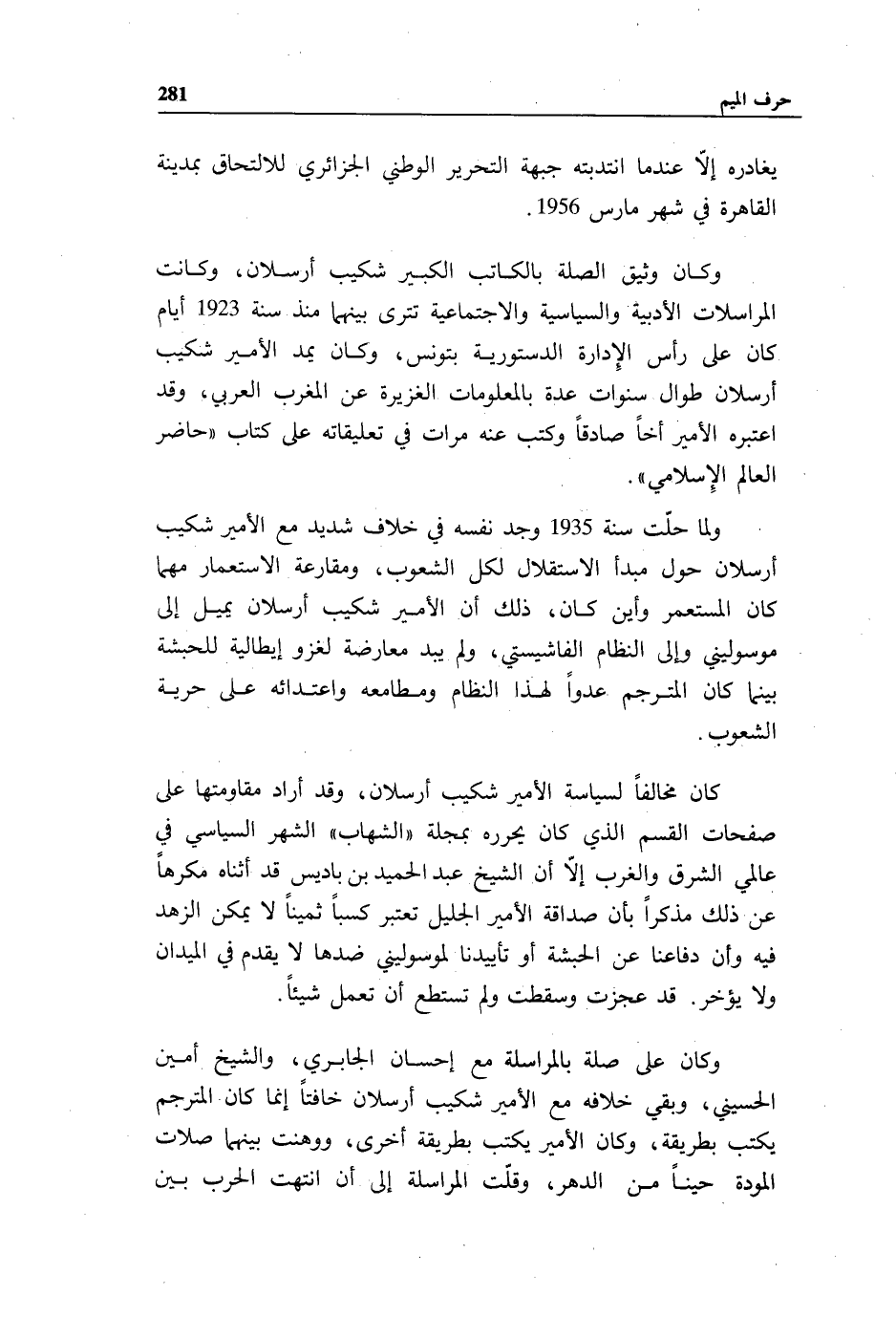ولما حلّت سنة 1935 وجد نفسه في خلاف شديد مع الأمير شكيب أرسلان حول مبدأ الاستقلال لكل الشعوب، ومقارعة الاستعمار مهما كان المستعمر وأين كان، ذلك أن الأمير شكيب أرسلان يميل إلى موسوليني وإلى النظام الفاشيستي، ولم يبد معارضة لغزو إيطالية للحبشة بينما كان المترجم عدوا لهذا النظام ومطامعه واعتدائه على حرية الشعوب.