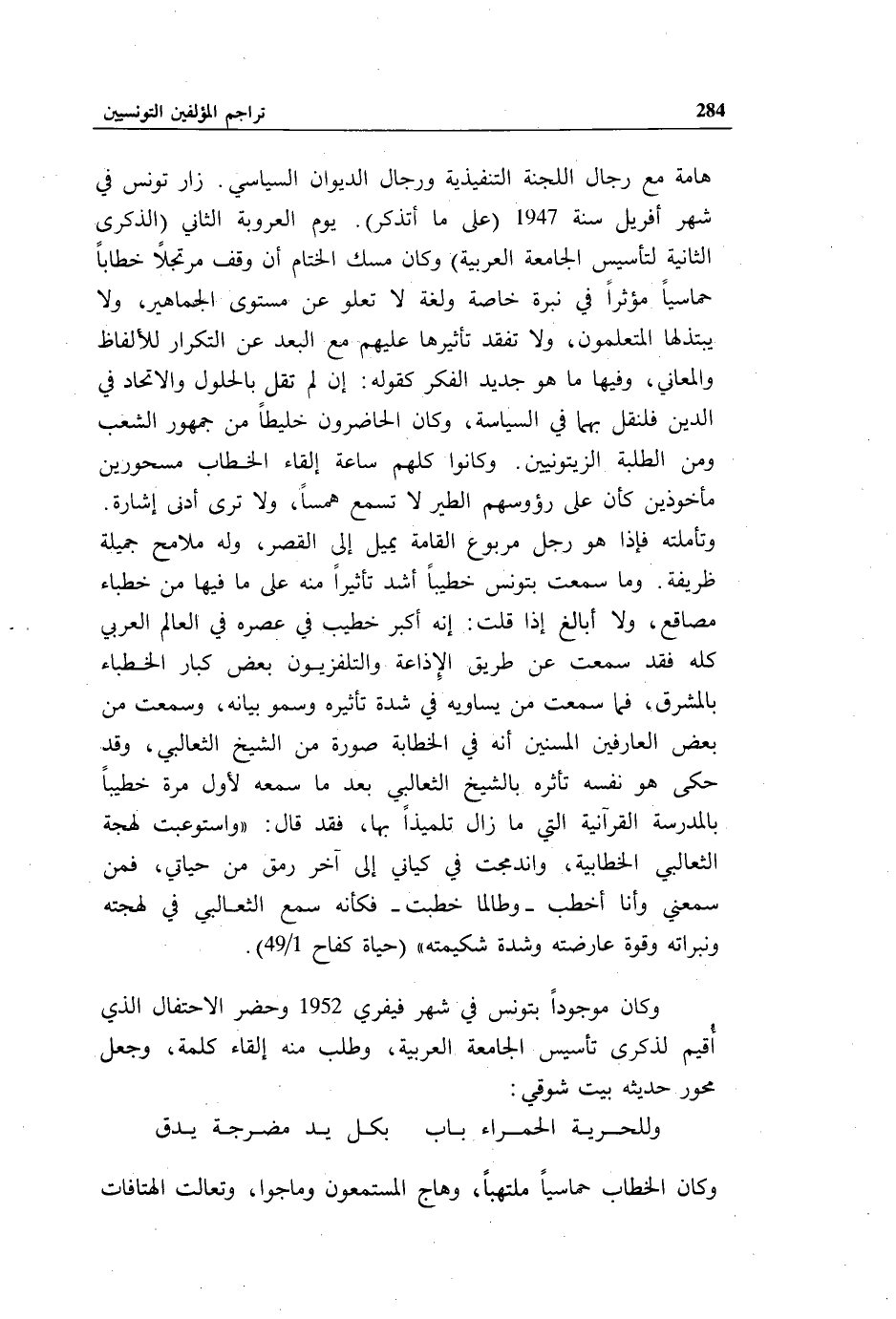 هامة مع رجال اللجنة التنفيذية ورجال الديوان السياسي. زار تونس في شهر أفريل سنة 1947 (على ما أتذكر). يوم العروبة الثاني (الذكرى الثانية لتأسيس الجامعة العربية) وكان مسك الختام أن وقف مرتجلا خطابا حماسيا مؤثرا في نبرة خاصة ولغة لا تعلو عن مستوى الجماهير، ولا يبتذلها المتعلمون، ولا تفقد تأثيرها عليهم مع البعد عن التكرار للألفاظ والمعاني، وفيها ما هو جديد الفكر كقوله: إن لم تقل بالحلول والاتحاد في الدين فلنقل بهما في السياسة، وكان الحاضرون خليطا من جمهور الشعب ومن الطلبة الزيتونيين. وكانوا كلهم ساعة إلقاء الخطاب مسحورين مأخوذين كأن على رءوسهم الطير لا تسمع همسا، ولا ترى أدنى إشارة.